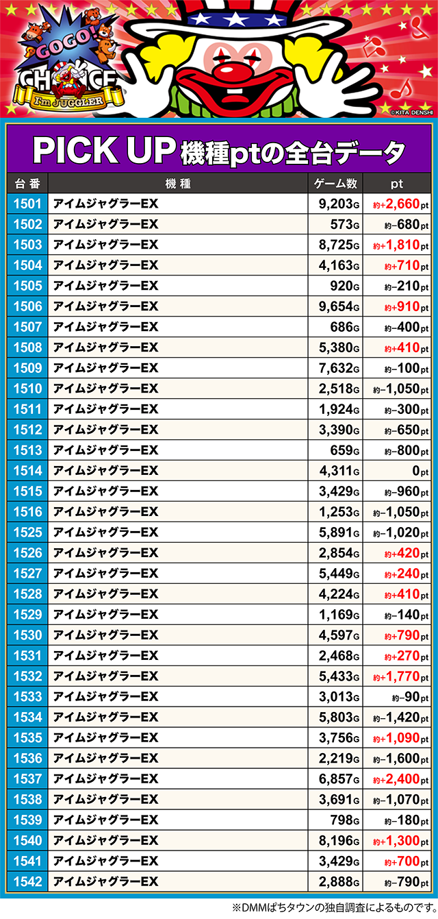 「アイムジャグラーEX」の1501番台と1537番台が約+2,400pt以上。