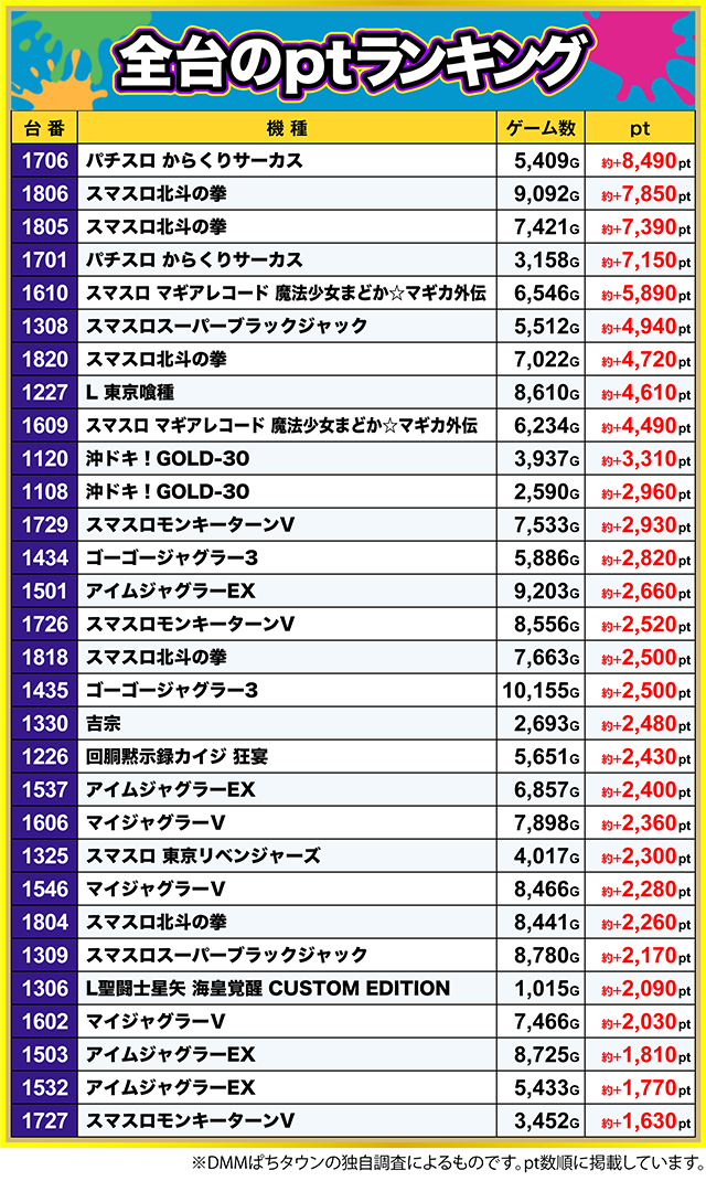 「スマスロ北斗の拳」の1806番台と1805番台も約+7,300pt以上となった。