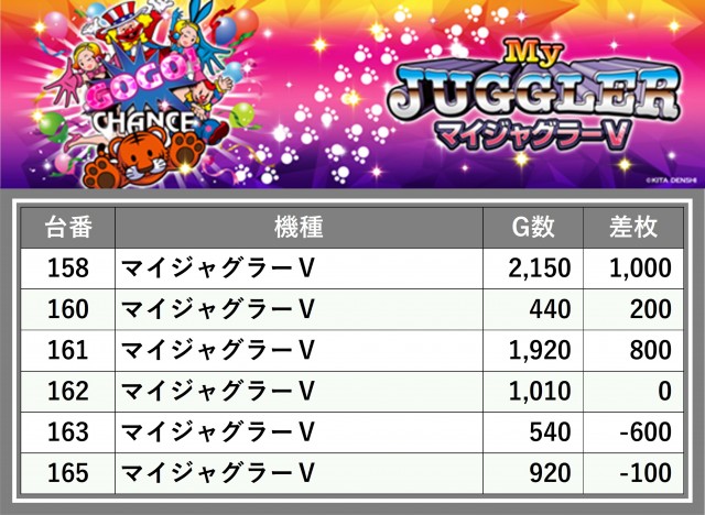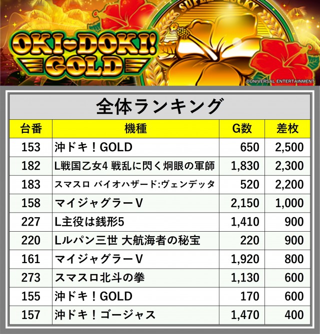 厳選された取材対象機種をはじめ、その他スロット全体から好記録が飛び出した!プレイヤーが楽しんだ1日を下記データにて振り返ってみて欲しい。