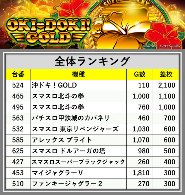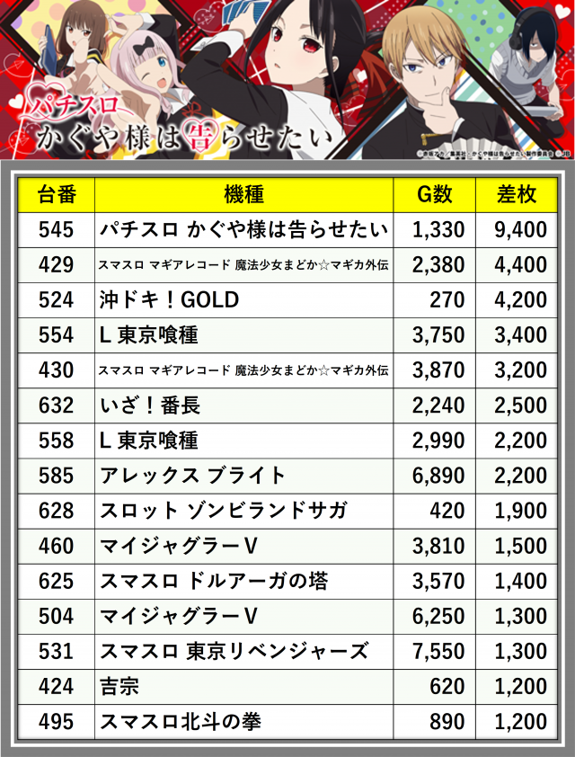 ※差枚数順に掲載しています
