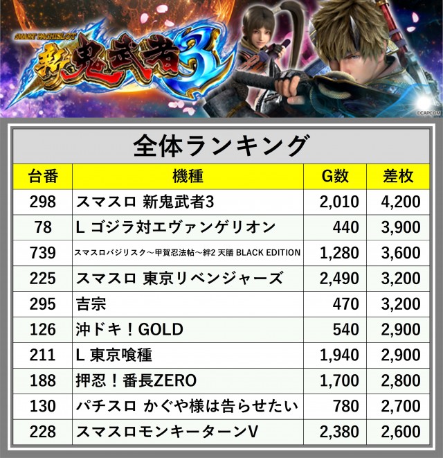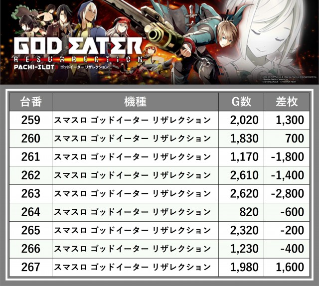 厳選された取材対象機種をはじめ、その他スロット全体から好記録が飛び出した!プレイヤーが楽しんだ1日を下記データにて振り返ってみて欲しい。
