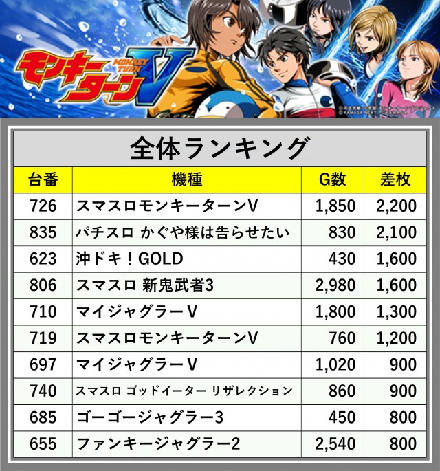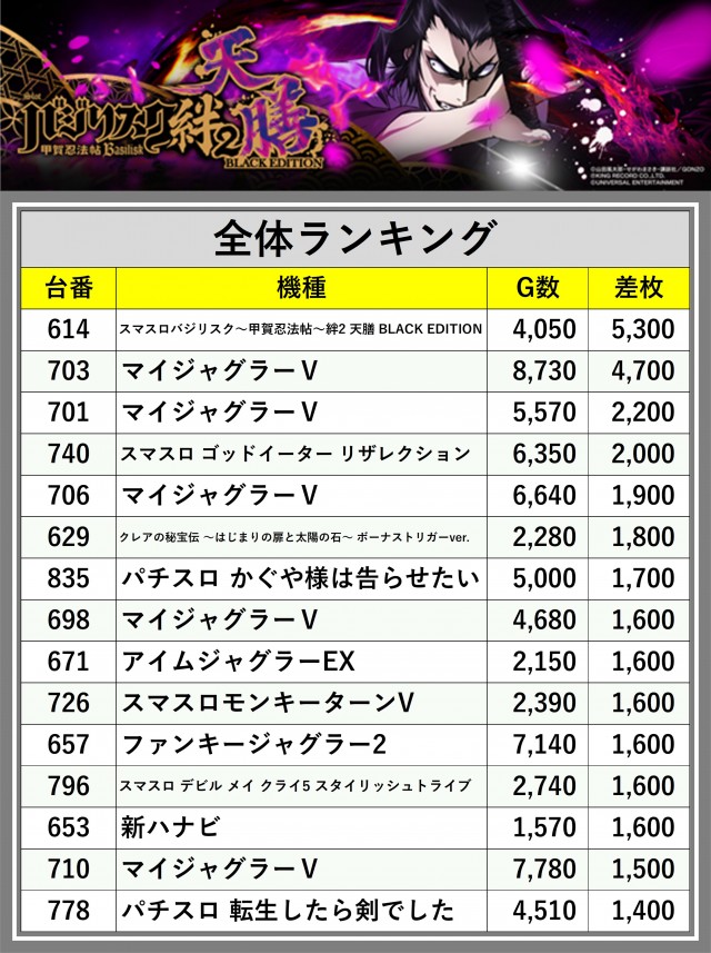 厳選された取材対象機種をはじめ、その他スロット全体から好記録が飛び出した!プレイヤーが楽しんだ1日を下記データにて振り返ってみて欲しい。