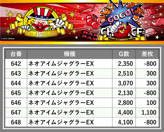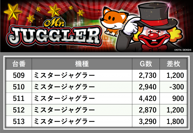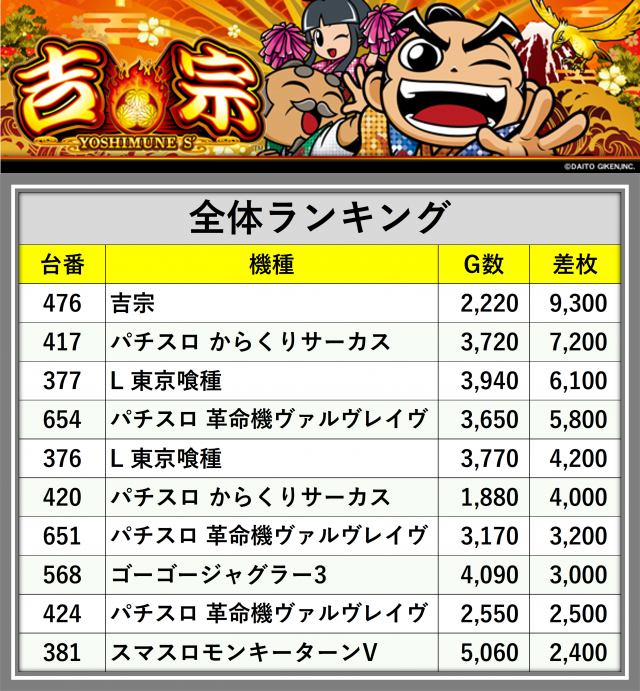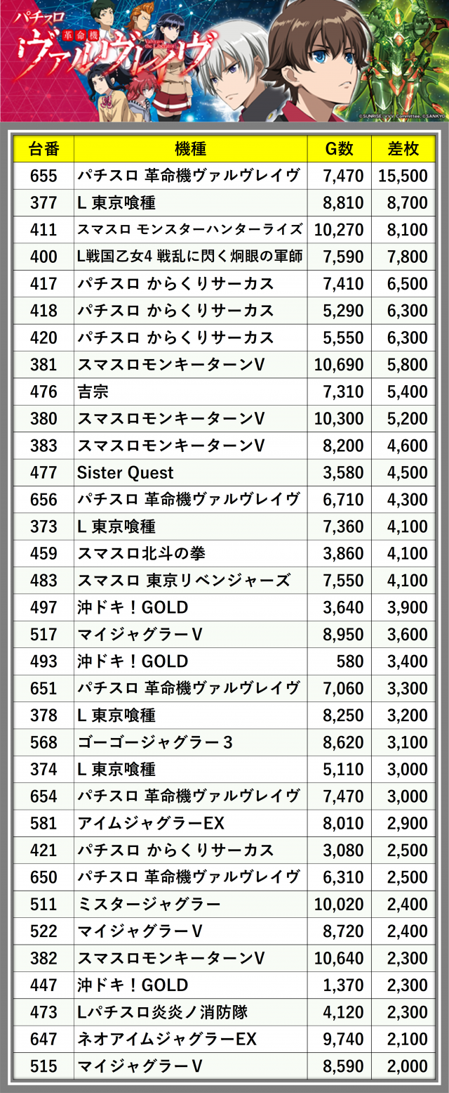 厳選された取材対象機種をはじめ、その他スロット全体から好記録が飛び出した!プレイヤーが楽しんだ1日を下記データにて振り返ってみて欲しい。