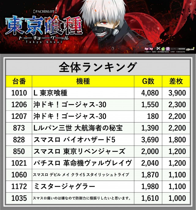 厳選された取材対象機種をはじめ、その他スロット全体から好記録が飛び出した!プレイヤーが楽しんだ1日を下記データにて振り返ってみて欲しい。