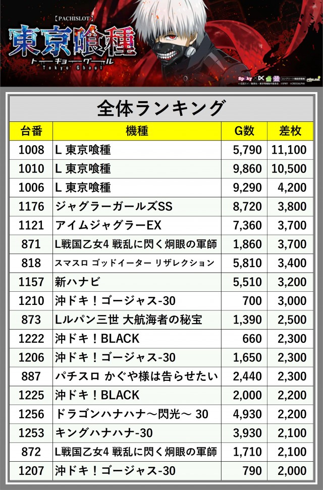 ※差枚数順に掲載しています
