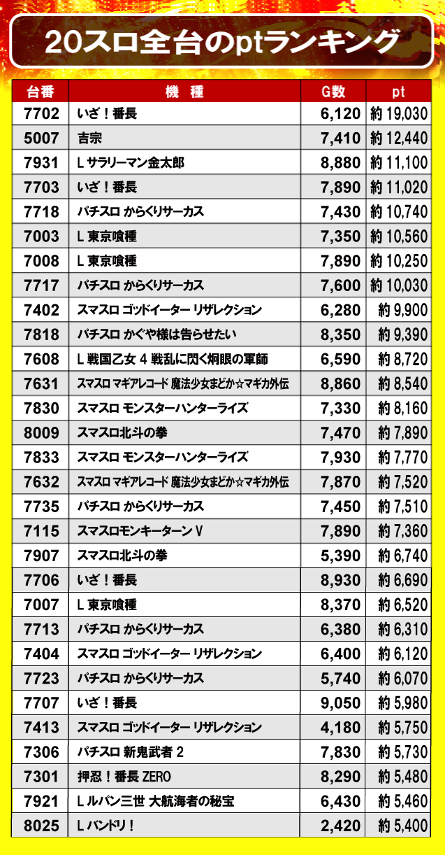 ①20スロ全台のptランキング