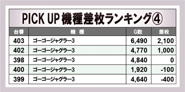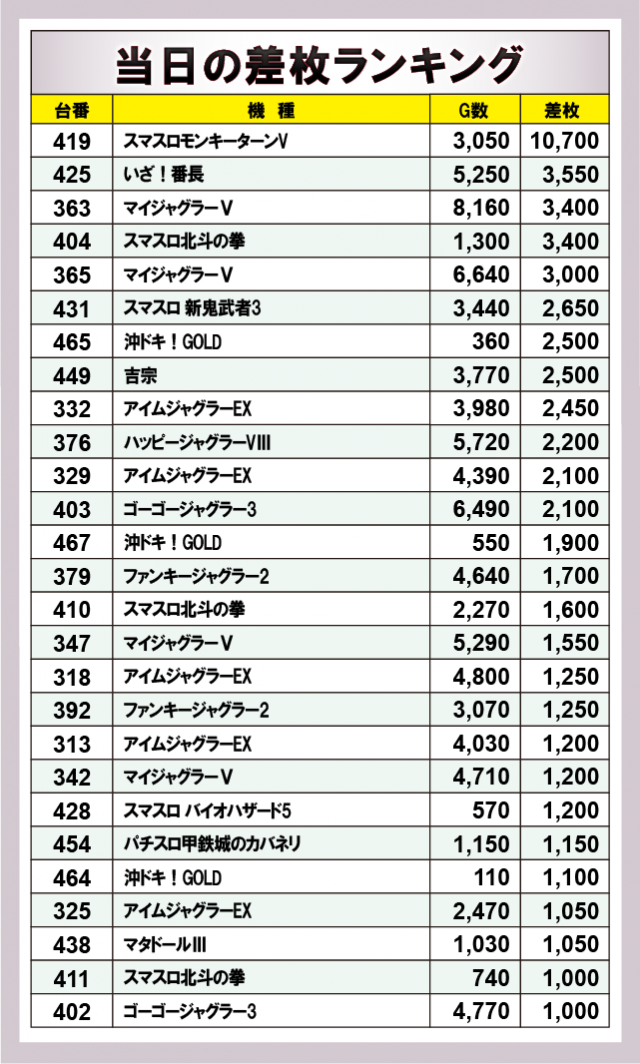 人気機種を中心に名を連ねているのが印象的だが、そのなかで『スマスロモンキーターンV』が万枚OVERと活躍。そのほか、『ジャグラー』シリーズを筆頭にメダル機から差枚数プラス4桁を多数輩出し、ファンが自信をもってレバーを叩いていた様子が目に浮かぶ。