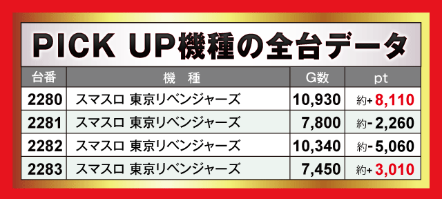 今回の全店共通PICK UP機種は『スマスロ 東京リベンジャーズ』。全店舗の総台数は24台で、そのうちの3分の2以上にあたる17台がプラス差枚となっている。しかも、平均差枚が+3,500pt超を記録しているだけに、各店舗のシマは常にファンの笑顔と活気に満ち溢れていた。