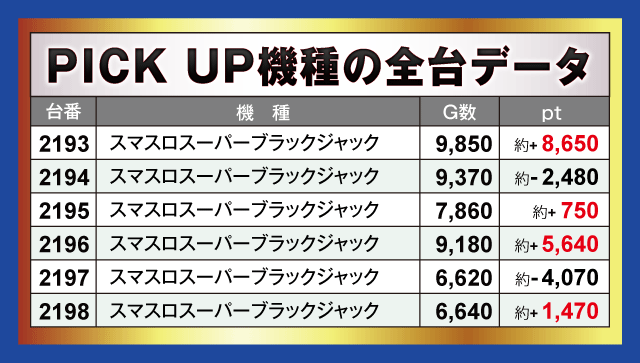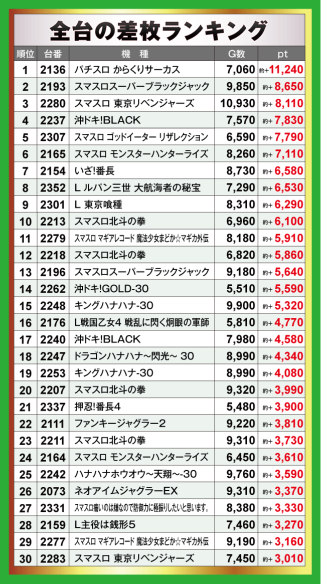 楽園沼津店では、『スマスロスーパーブラックジャック』から+8,000pt超に+5,000pt超といったハイスコアが発生。また、『ハナハナホウオウ~天翔~-30』は3台全てがプラス差枚となっている。