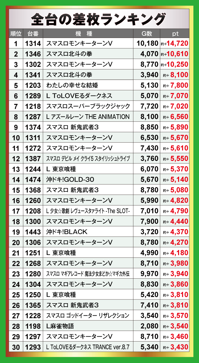 また、その他の機種では『わたしの幸せな結婚』と『L ToLOVEるダークネス』、さらには『スマスロスーパーブラックジャック』から+7,000pt超、導入間もない新台の『スマスロ 新鬼武者3』から+5,000pt超が2台も発生しており、新旧を問わず広範囲に渡ってチャンスが潜んでいたのは間違いないだろう。