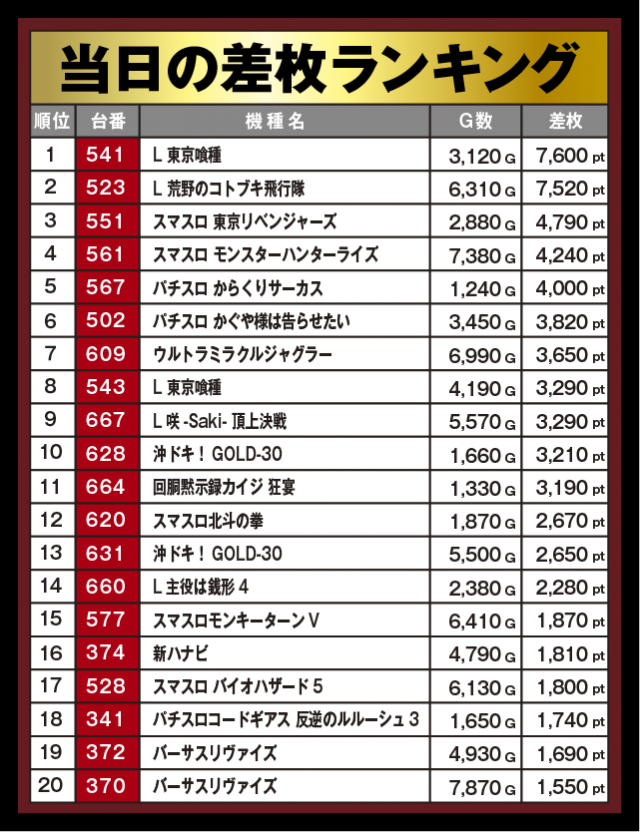 この日のSAPグループはひと味違う。DMMぱちタウンは、「SAP野田」の特別なひとときを一斉取材した。特に華々しい活躍を残した機種たちをピックアップして紹介しよう。まずは差枚ランキングの発表だ!