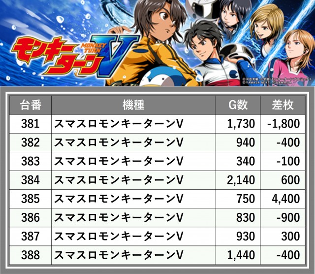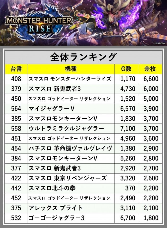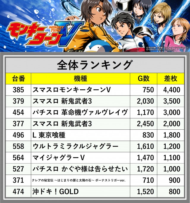 厳選された取材対象機種をはじめ、その他スロット全体から好記録が飛び出した!プレイヤーが楽しんだ1日を下記データにて振り返ってみて欲しい。