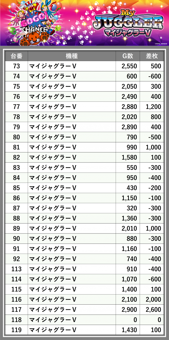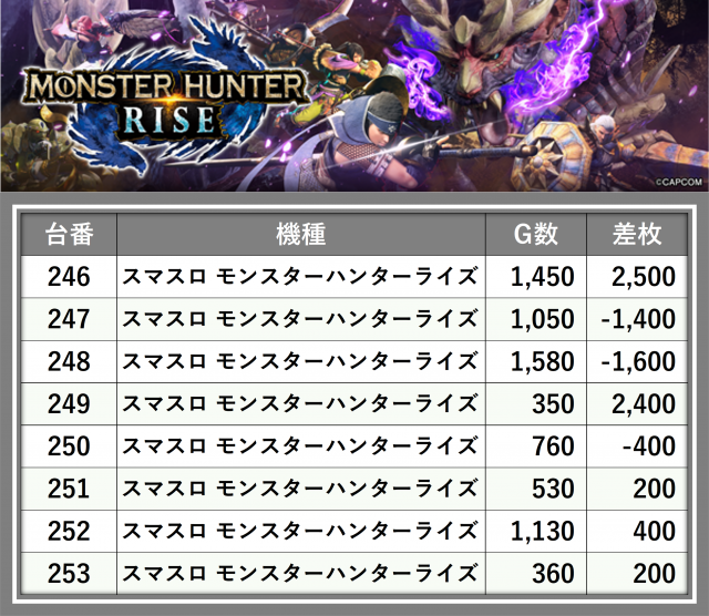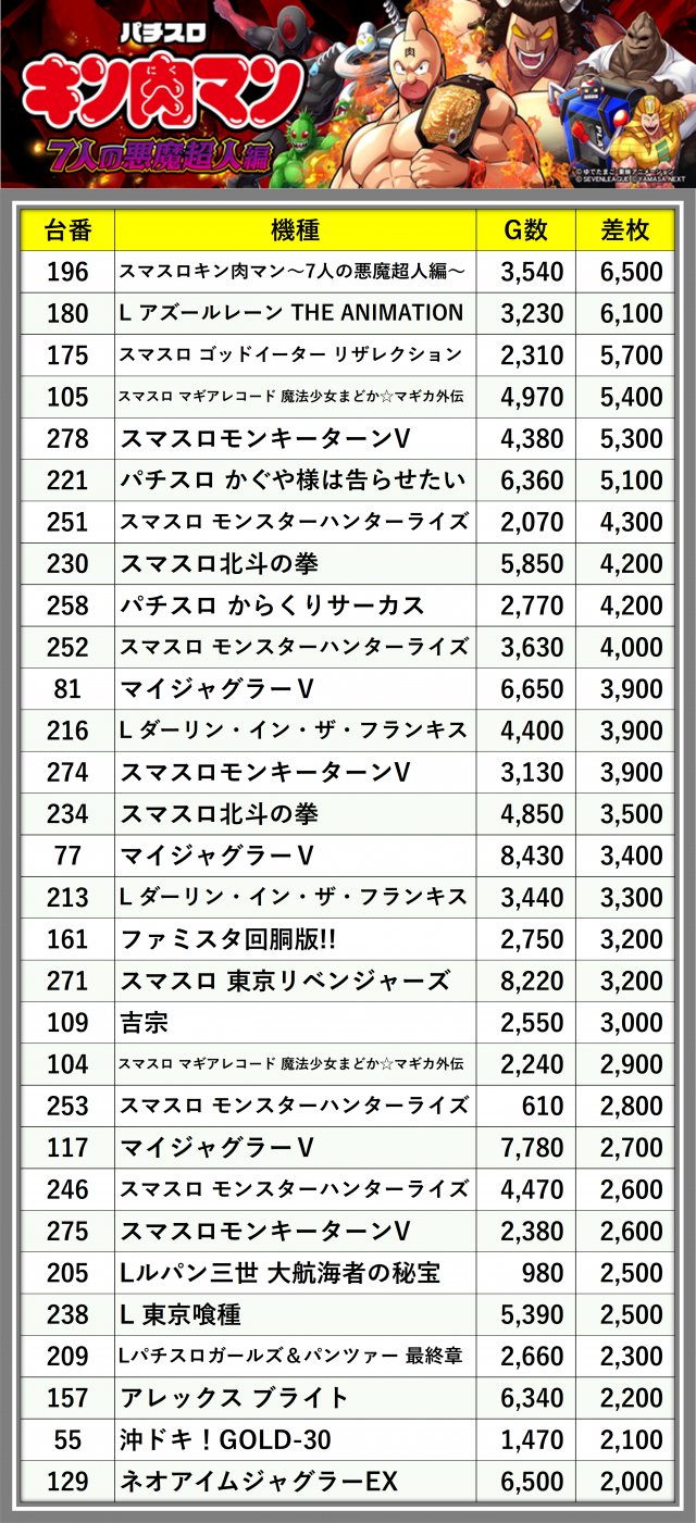 厳選された取材対象機種をはじめ、その他スロット全体から好記録が飛び出した!プレイヤーが楽しんだ1日を下記データにて振り返ってみて欲しい。
