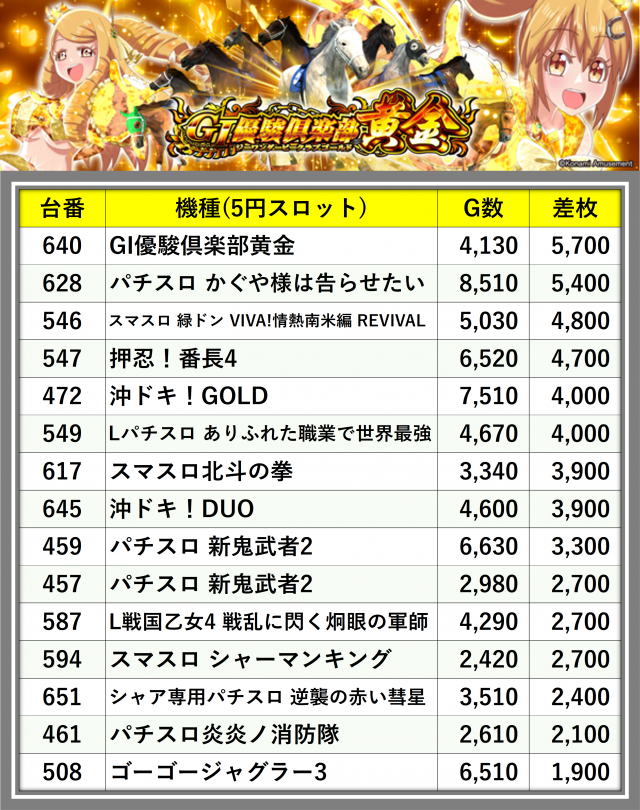 ※差枚数順に掲載しています
