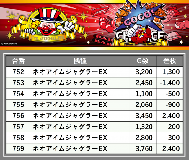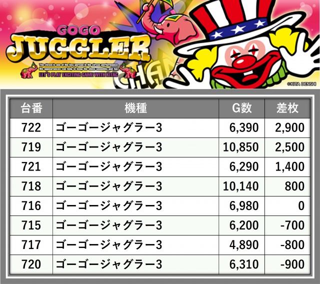 厳選された取材対象機種をはじめ、その他スロット全体から好記録が飛び出した!プレイヤーが楽しんだ1日を下記データにて振り返ってみて欲しい。