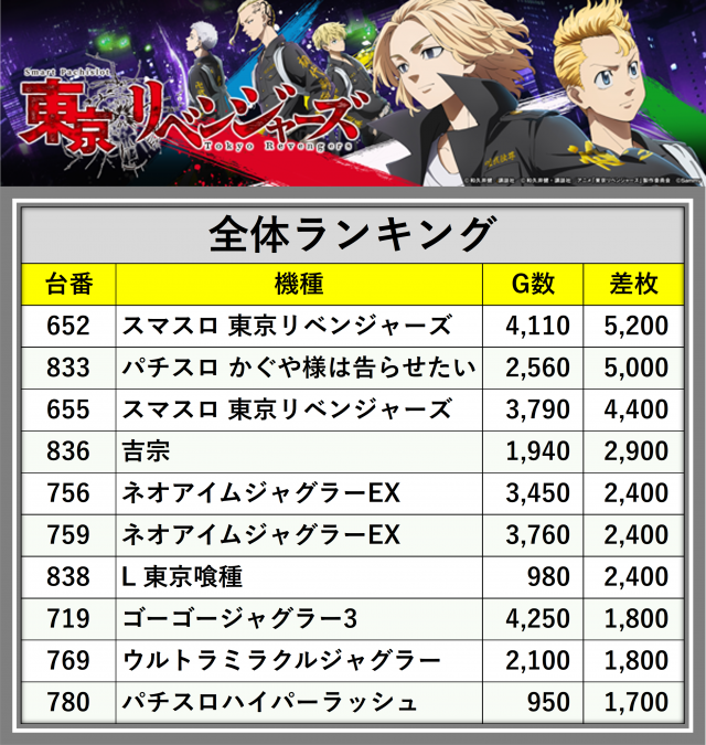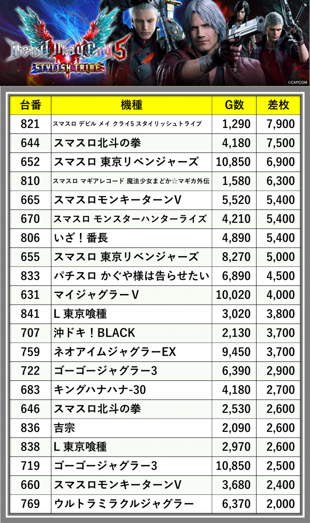 ※差枚数順に掲載しています