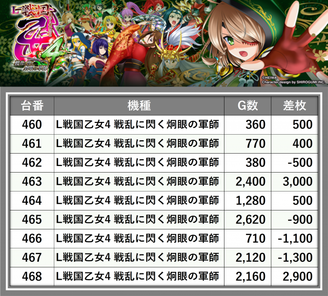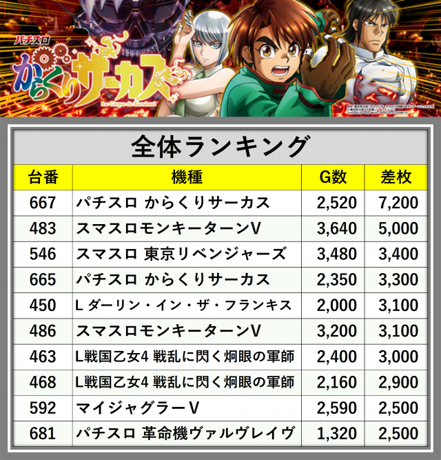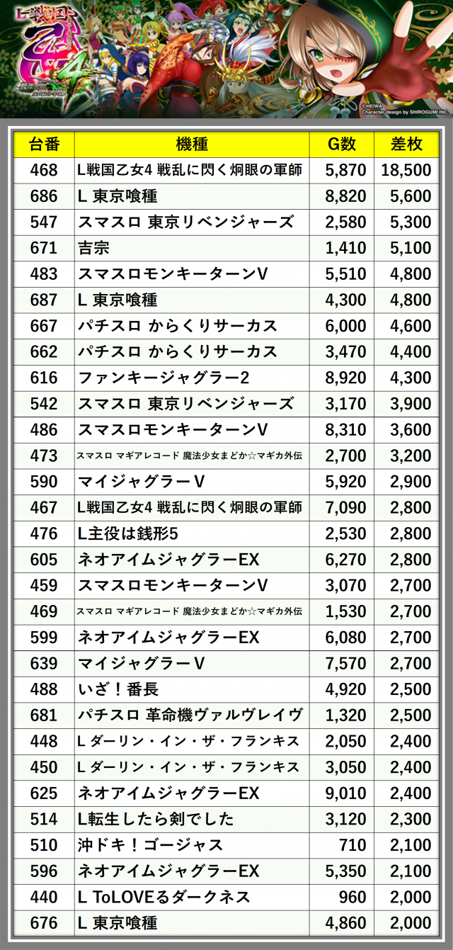 ※差枚数順に掲載しています