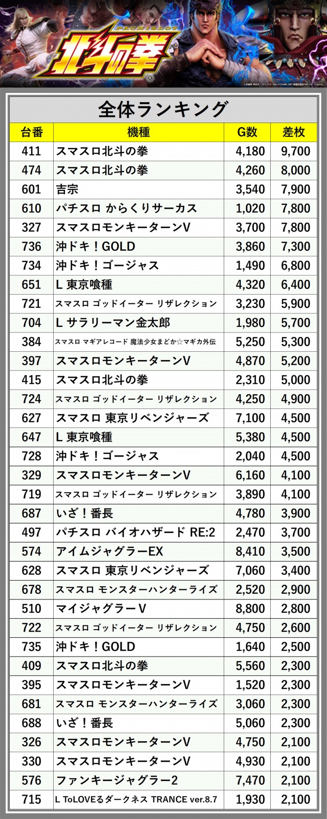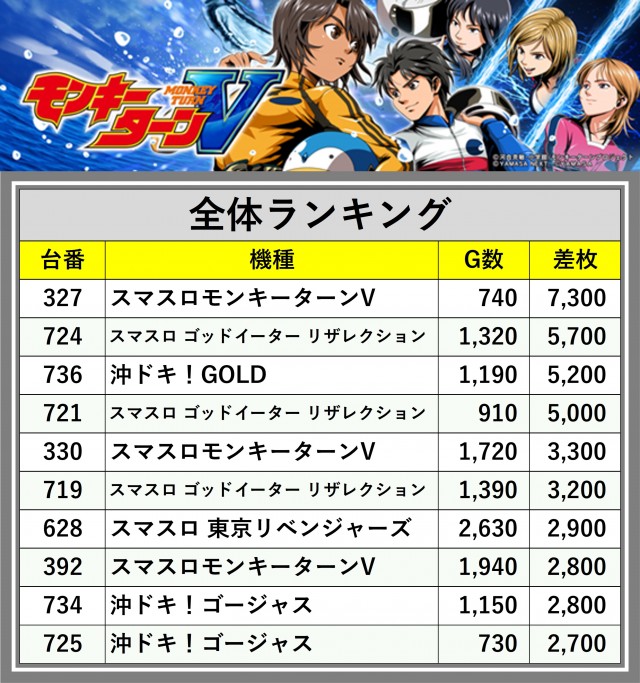 厳選された取材対象機種をはじめ、その他スロット全体から好記録が飛び出した!プレイヤーが楽しんだ1日を下記データにて振り返ってみて欲しい。