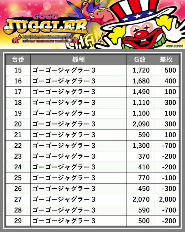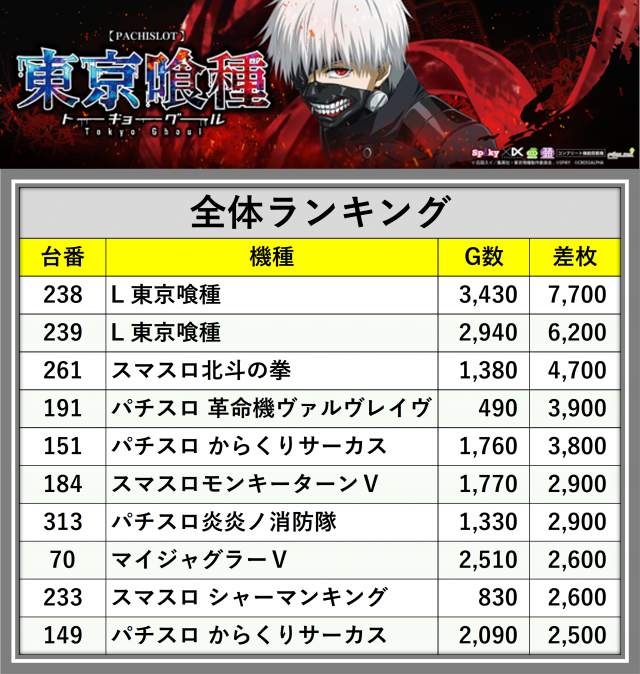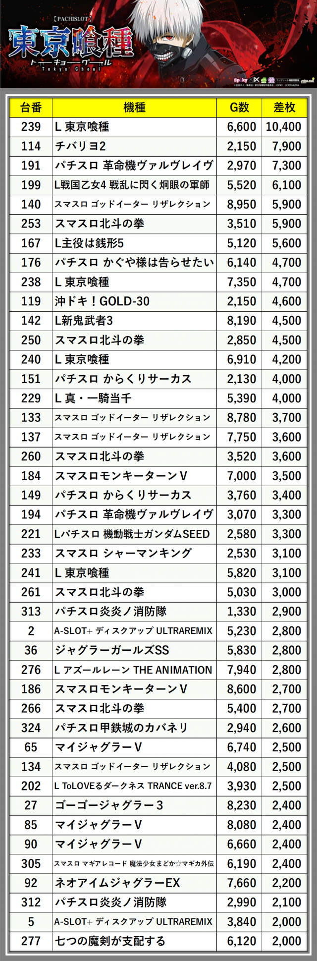 ※差枚数順に掲載しています