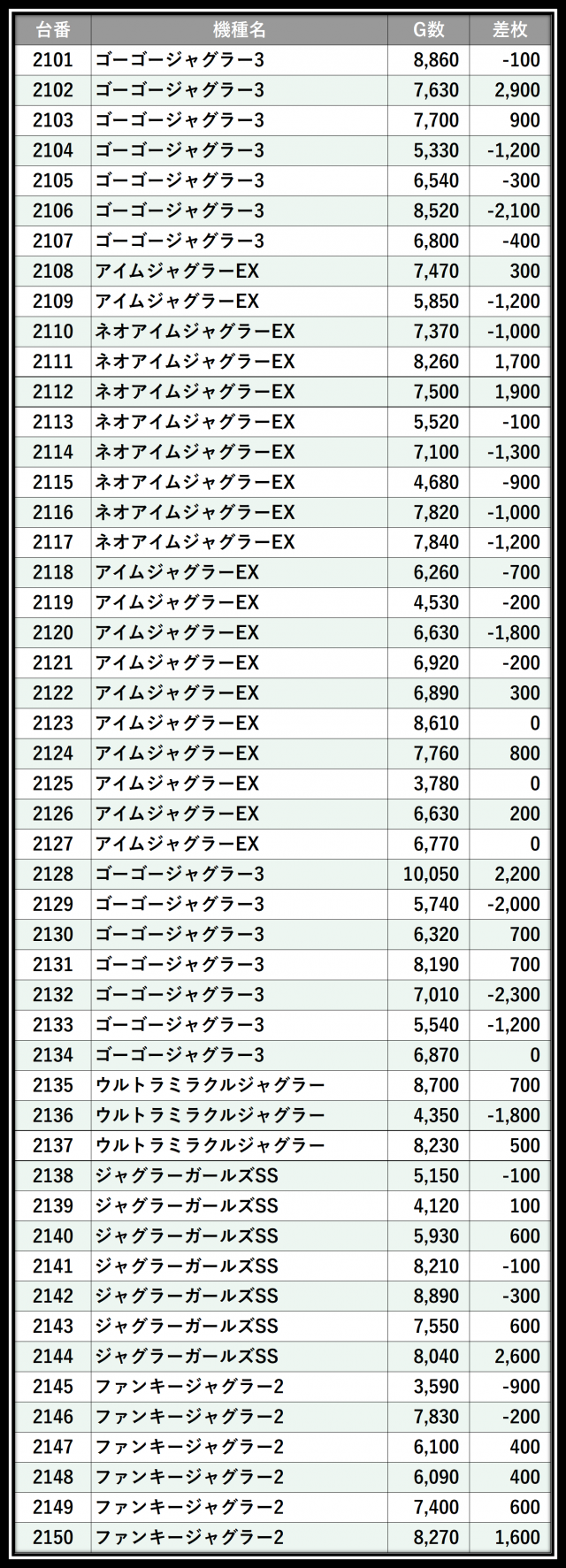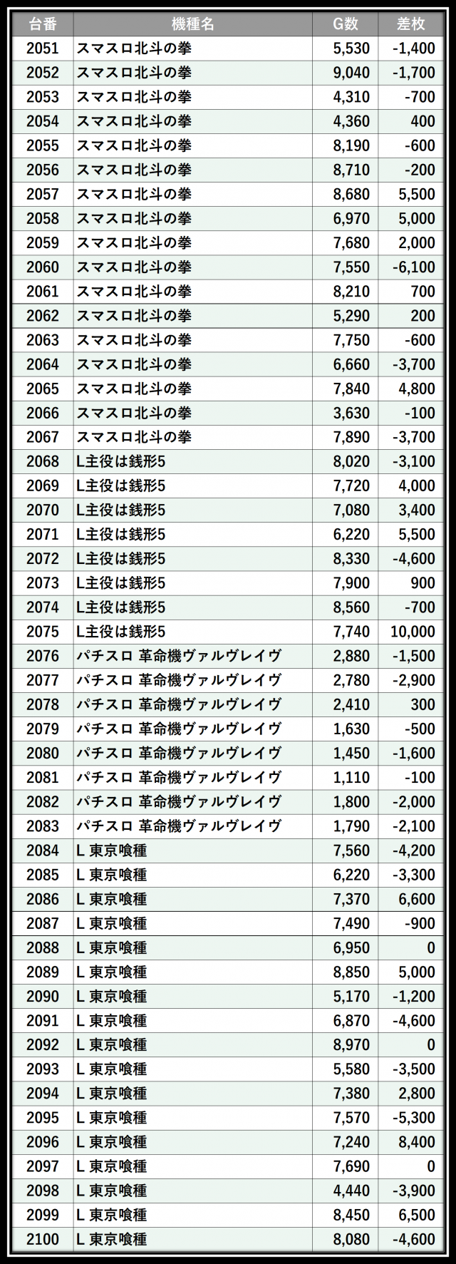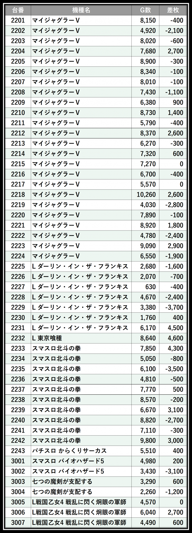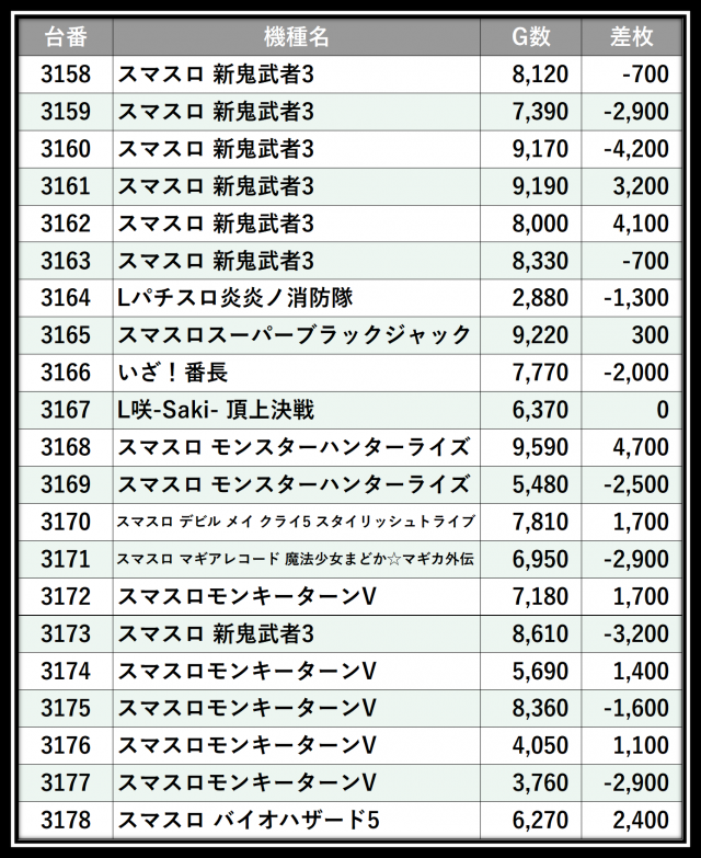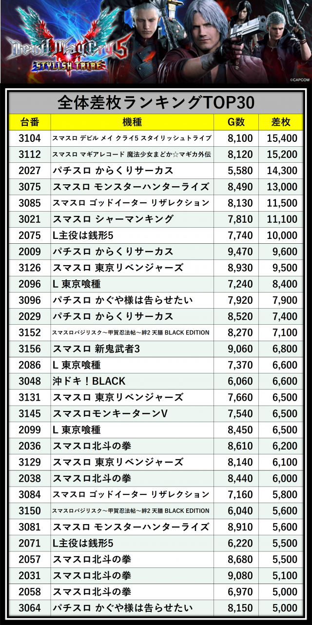 ※差枚数順に掲載しています