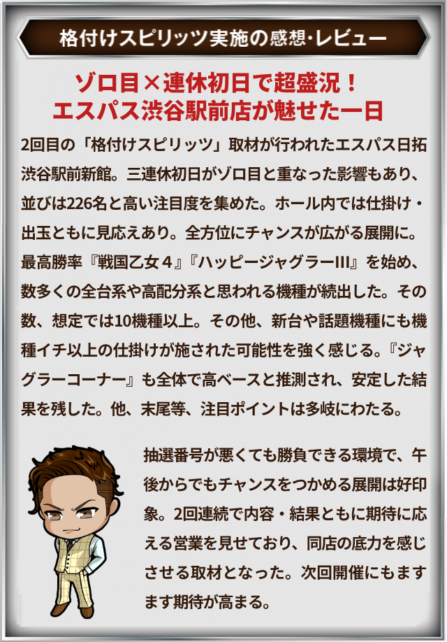 10月11日(土)エスパス日拓渋谷駅前新館にて、DMMぱちタウンの「格付けスピリッツ」を実施。