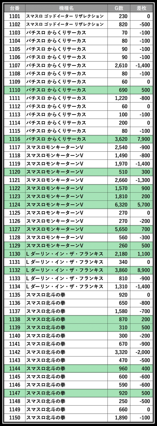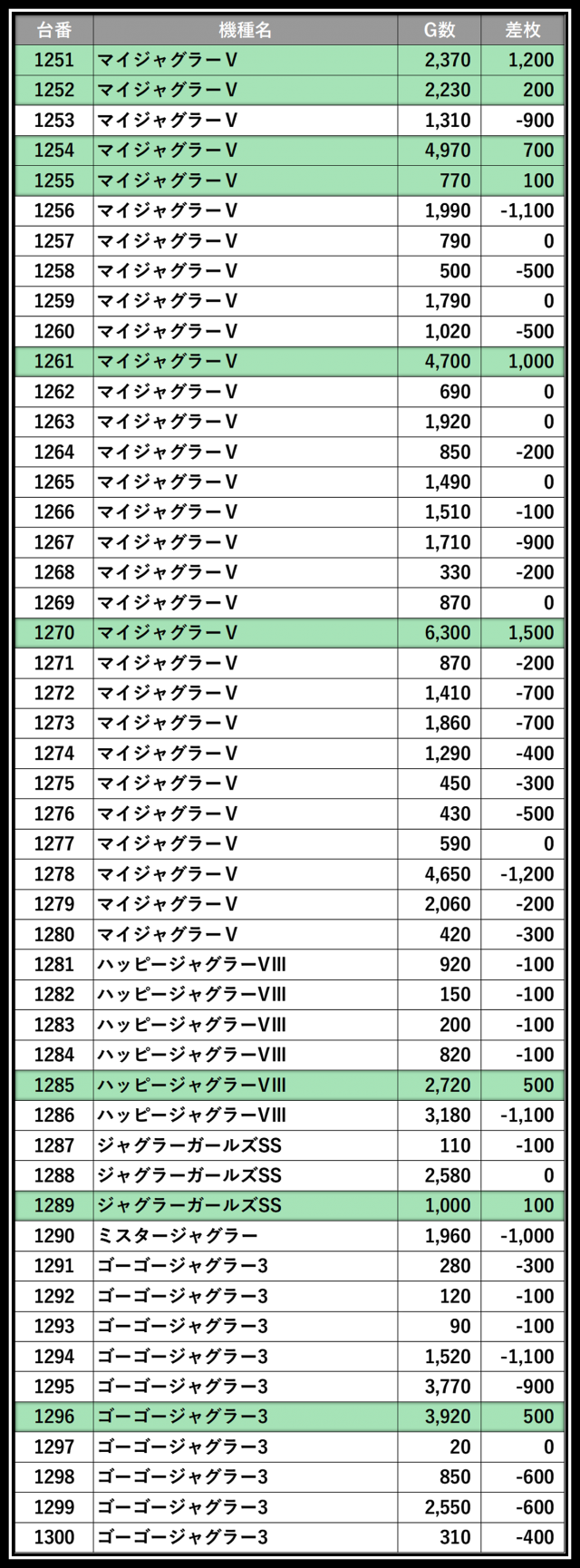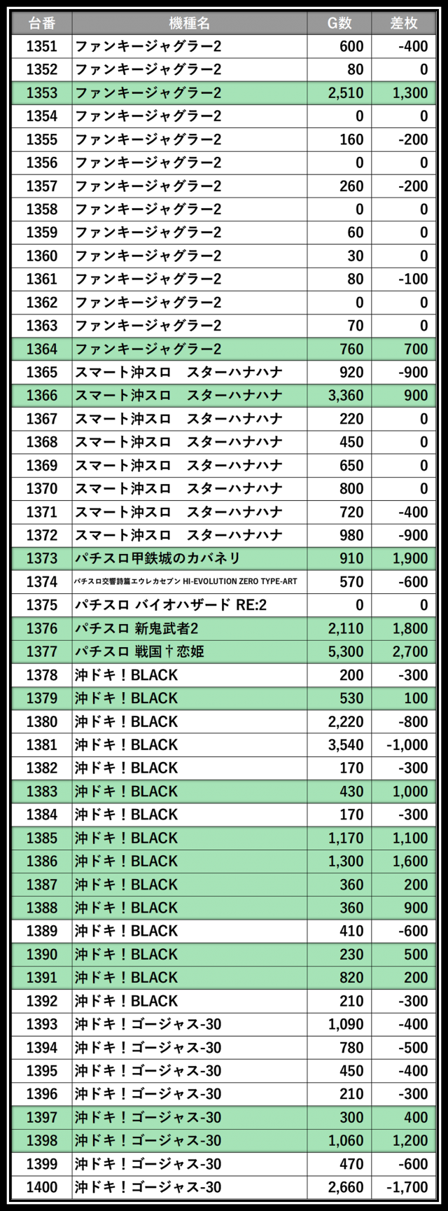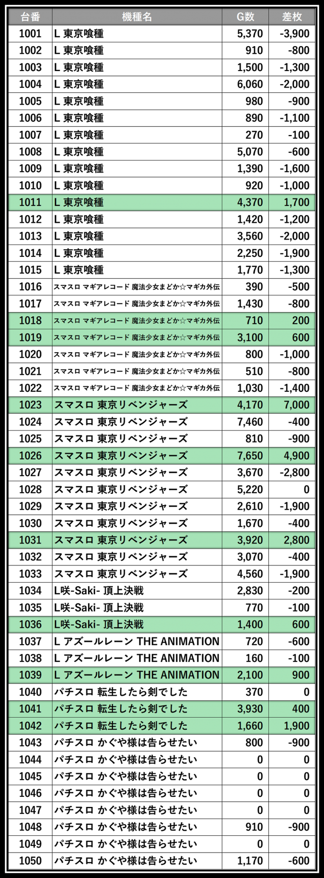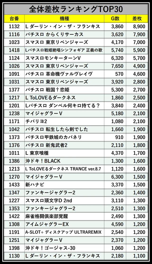 ※差枚数順に掲載しています