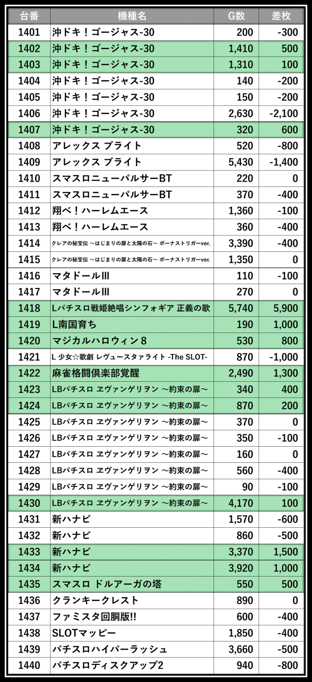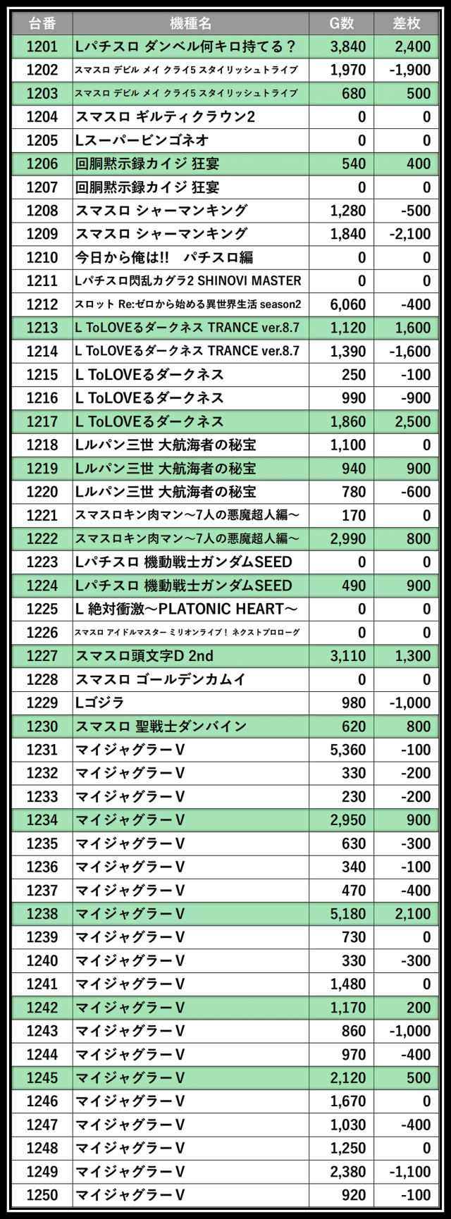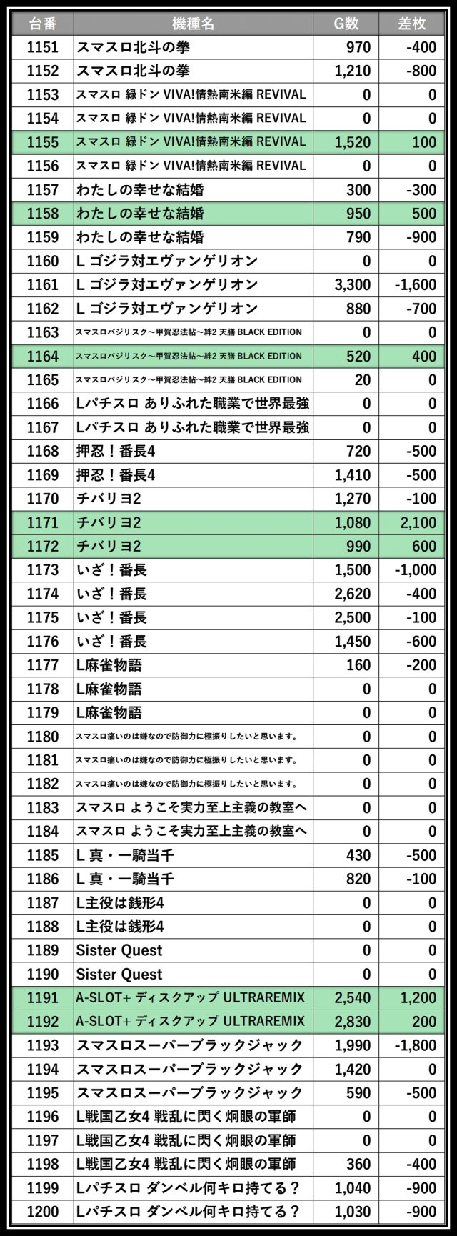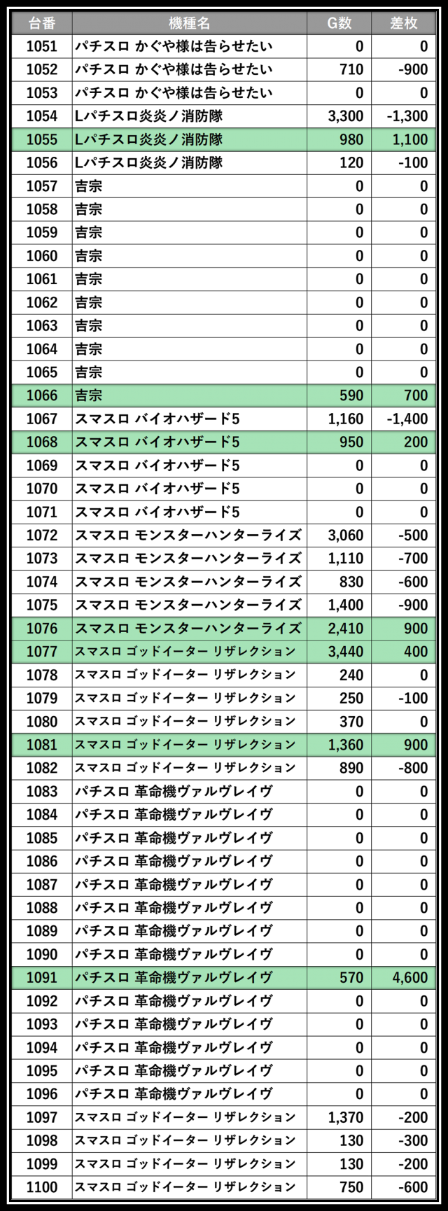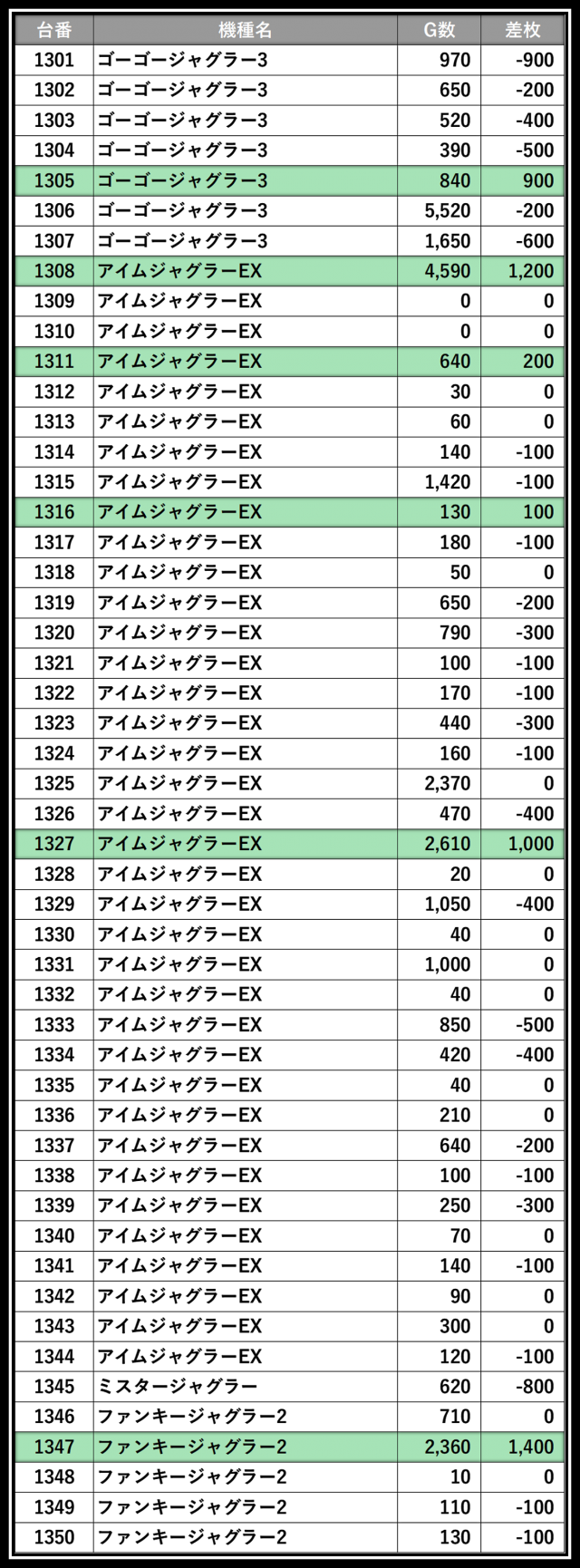 ※差枚数順に掲載しています