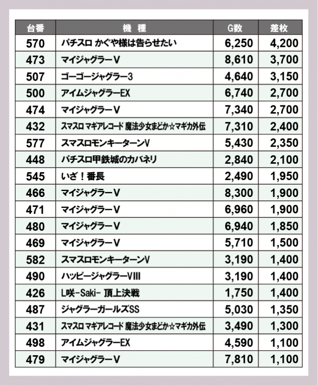 ※差枚数順に掲載しています