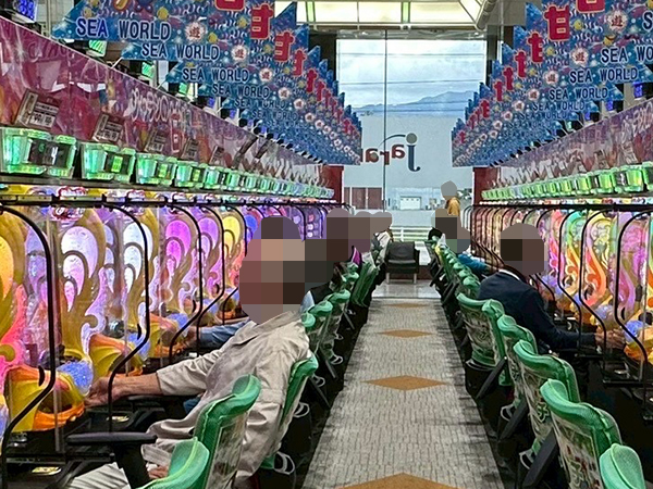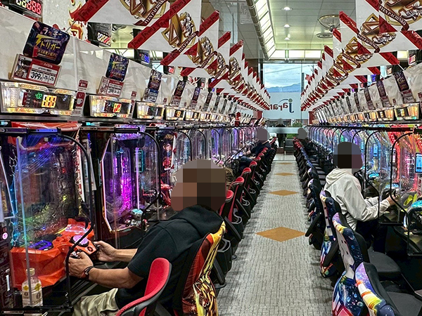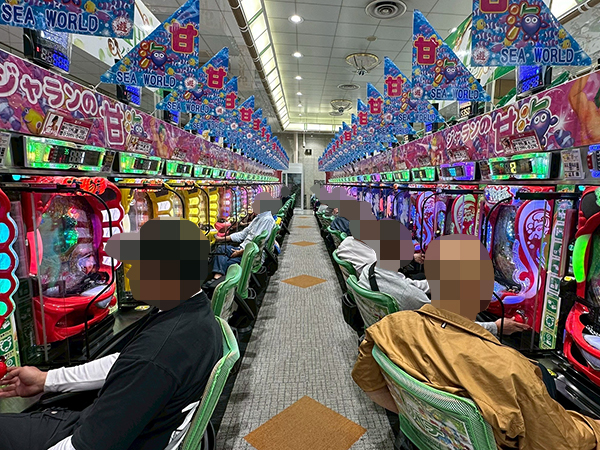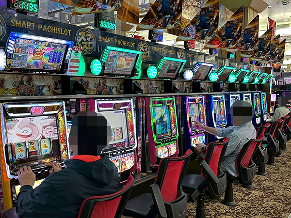 取材時は多くのプレイヤーが来店。パチンコ・パチスロともに、様々な機種が支持を得ていた。