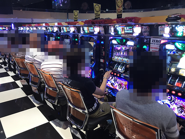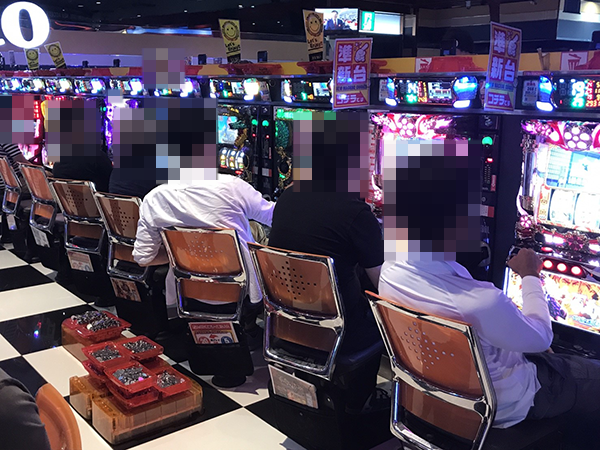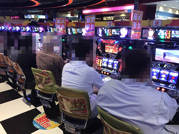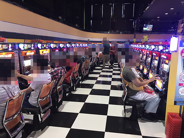 15時を過ぎた頃の20円パチスロでは、「バジリスク~甲賀忍法帖~絆」が盛況。機種の性能を引き出せているといったプレイヤーが多く、シマ全体に魅力的な光景が広がっていた。