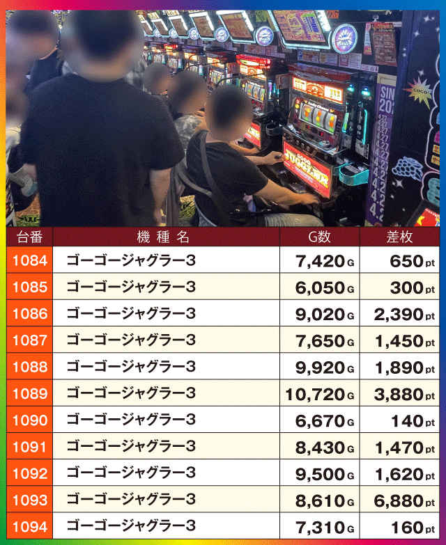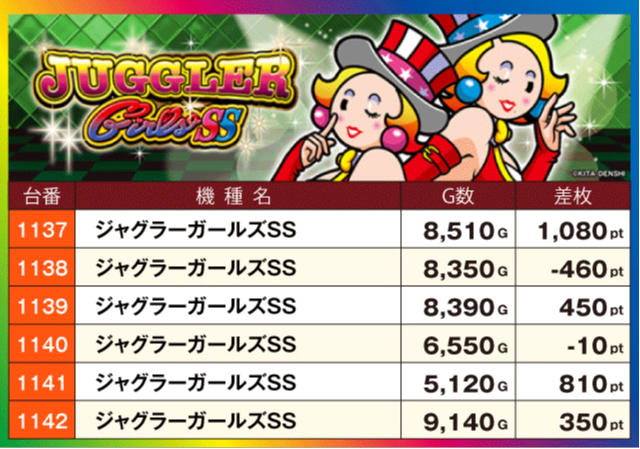 今回の注目機種は全4機種で、ハイスコアが飛び出した台以外からも多数の好調台を確認。なかでも、『ゴーゴージャグラー3』と『いざ!番長』は、全ての台がプラス差枚で実戦を終える驚異的な結果を残しているだけに、両機種のシマは常にファンの笑顔と活気に満ち溢れる一日となった。