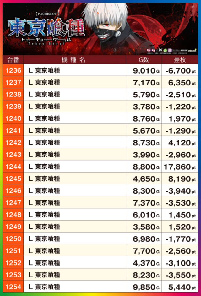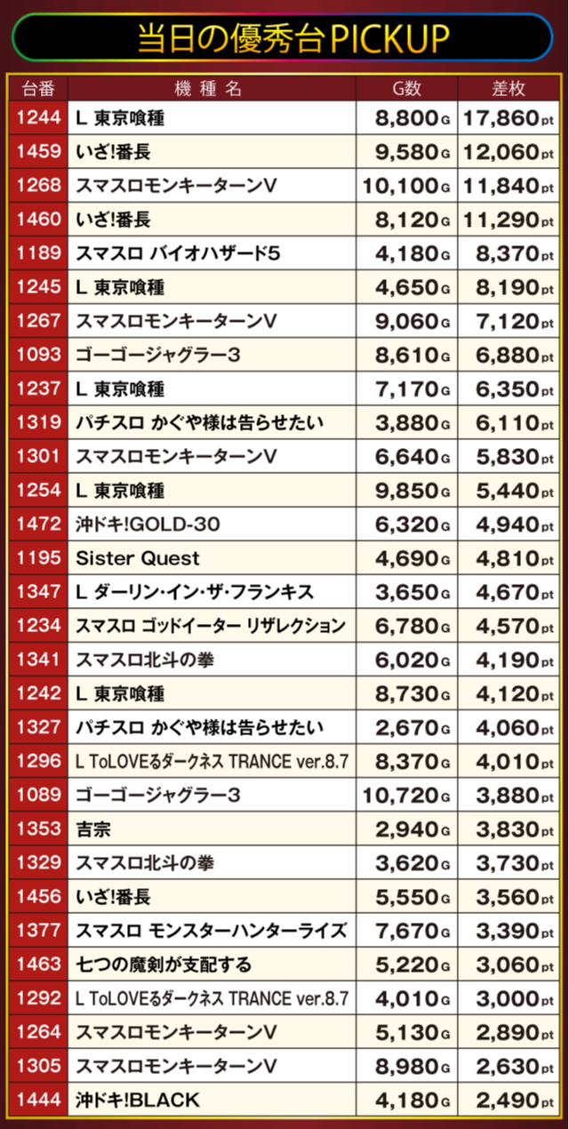 この日、最もプレイヤーの注目を集めたのが『L 東京喰種』で、1244番台が怒涛の+17,000pt超を叩き出し堂々のランキングトップに。さらに、『いざ!番長』から2台、『スマスロモンキーターンV』から1台の万枚超が発生しており、差枚上位機種が実にハイレベルな結果を残しファンを喜ばせていた。