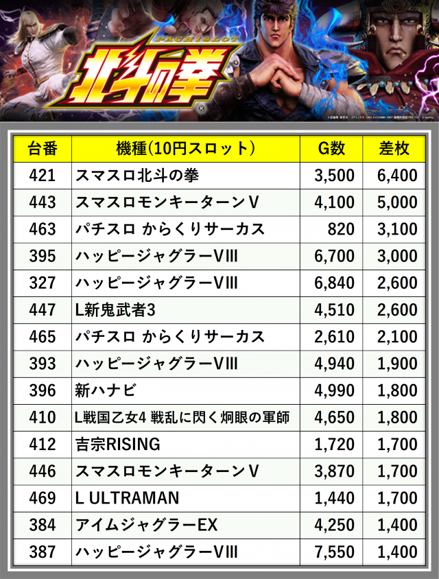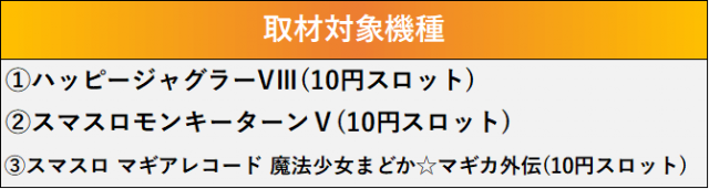 厳選された取材対象機種をはじめ、その他スロット全体から好記録が飛び出した!プレイヤーが楽しんだ1日を下記データにて振り返ってみて欲しい。