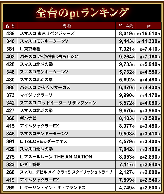 「L 東京喰種」の381番台と「パチスロ かぐや様は告らせたい」の402番台も約+7,100ptオーバー。
