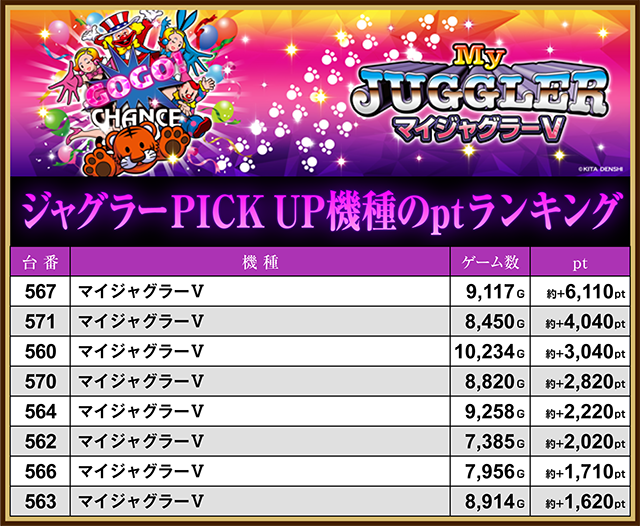「パチンコプラザ袖師」の「マイジャグラーⅤ」は、567番台が約+6,110pt。