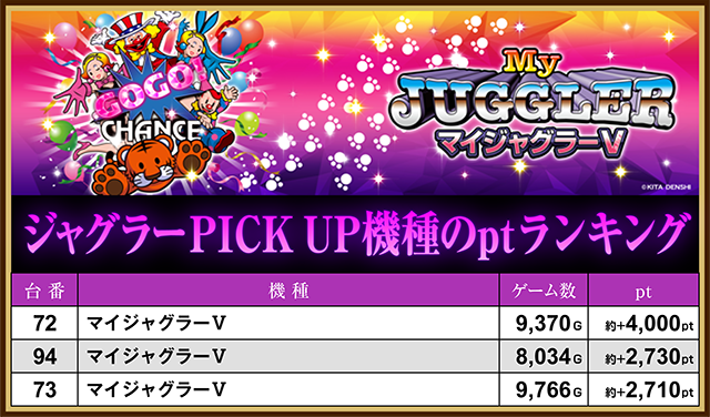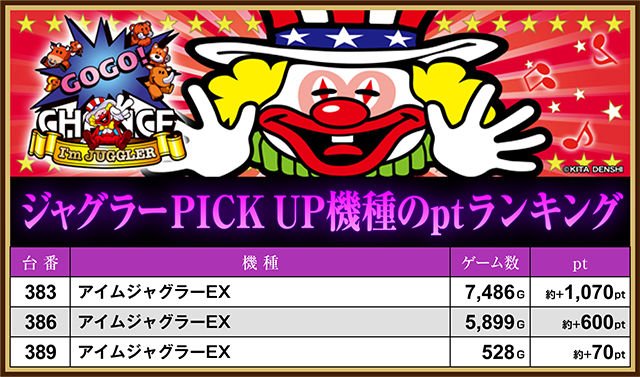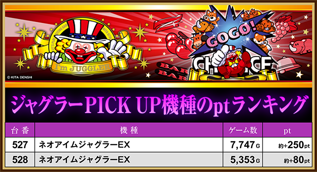 「アイムジャグラーEX」と「ゴーゴージャグラー3」も2台が約+1,800ptを上回った。
