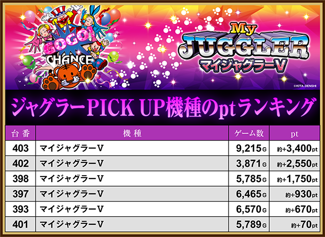 「パチンコプラザ瀬名店」においては、「マイジャグラーⅤ」の403番台が約+3,400pt。
