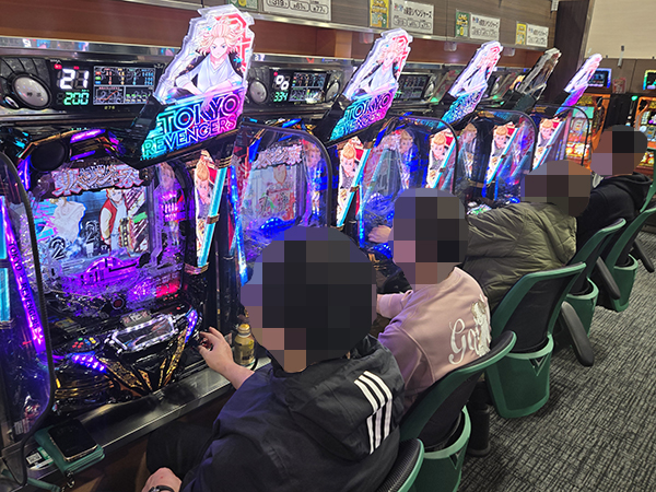 夕方の4円パチンコでは「e 東京喰種」や「eフィーバー炎炎ノ消防隊2 紅丸ver.」、「e東京リベンジャーズ」で好調なプレイヤーが多数見受けられ、時折見せる嬉しそうな様子が印象に残っている。