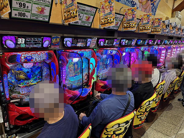 取材時は既に多くのプレイヤーが集結し、パチンコ・パチスロを問わずにぎやかな状況となっていた。