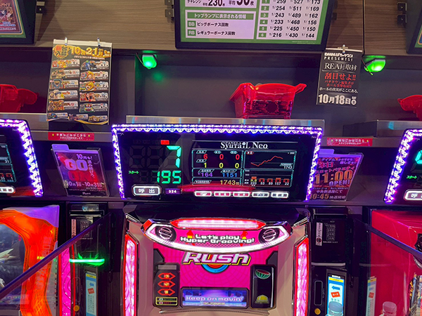 500円/89枚パチスロの盛り上がりも大きく、各シマに華やかな光景が広がっていた。
