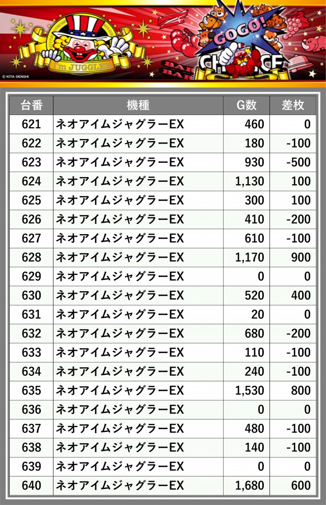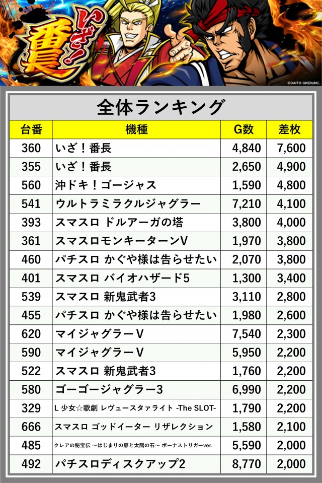 厳選された取材対象機種をはじめ、その他スロット全体から好記録が飛び出した!プレイヤーが楽しんだ1日を下記データにて振り返ってみて欲しい。