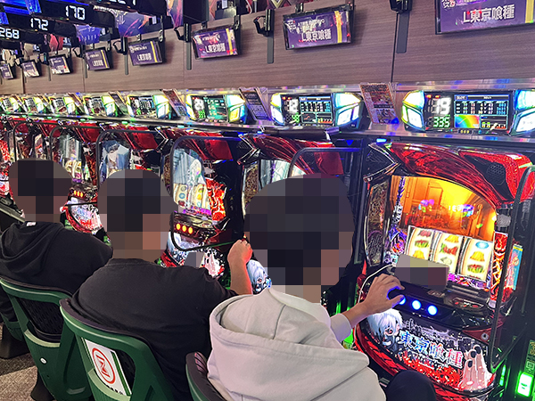 「L 東京喰種」や「スマスロモンキーターンV」などで機種性能を最大限に発揮するプレイヤーを確認。周囲から注目を集めていた。