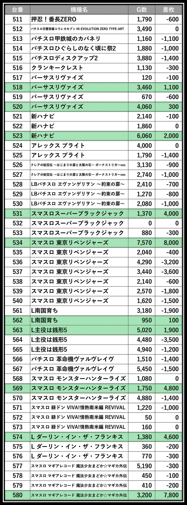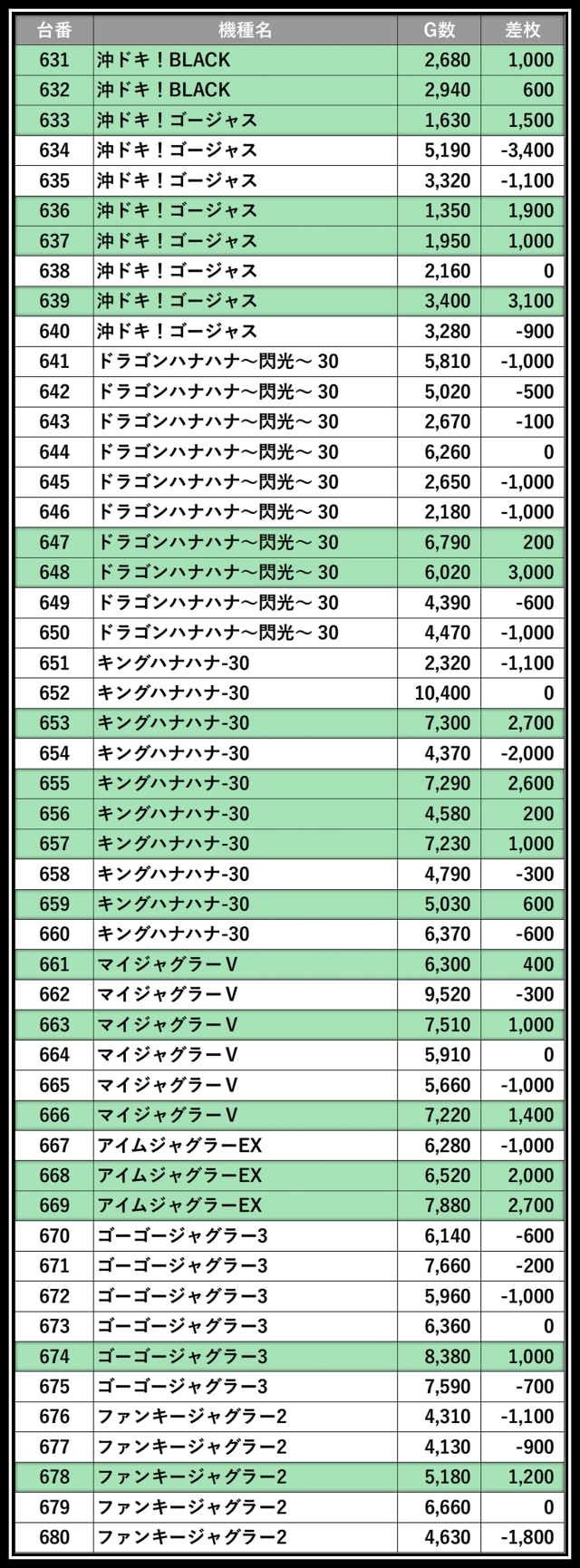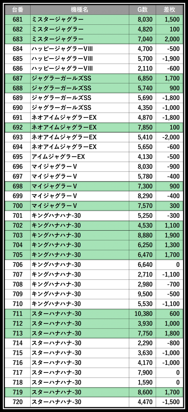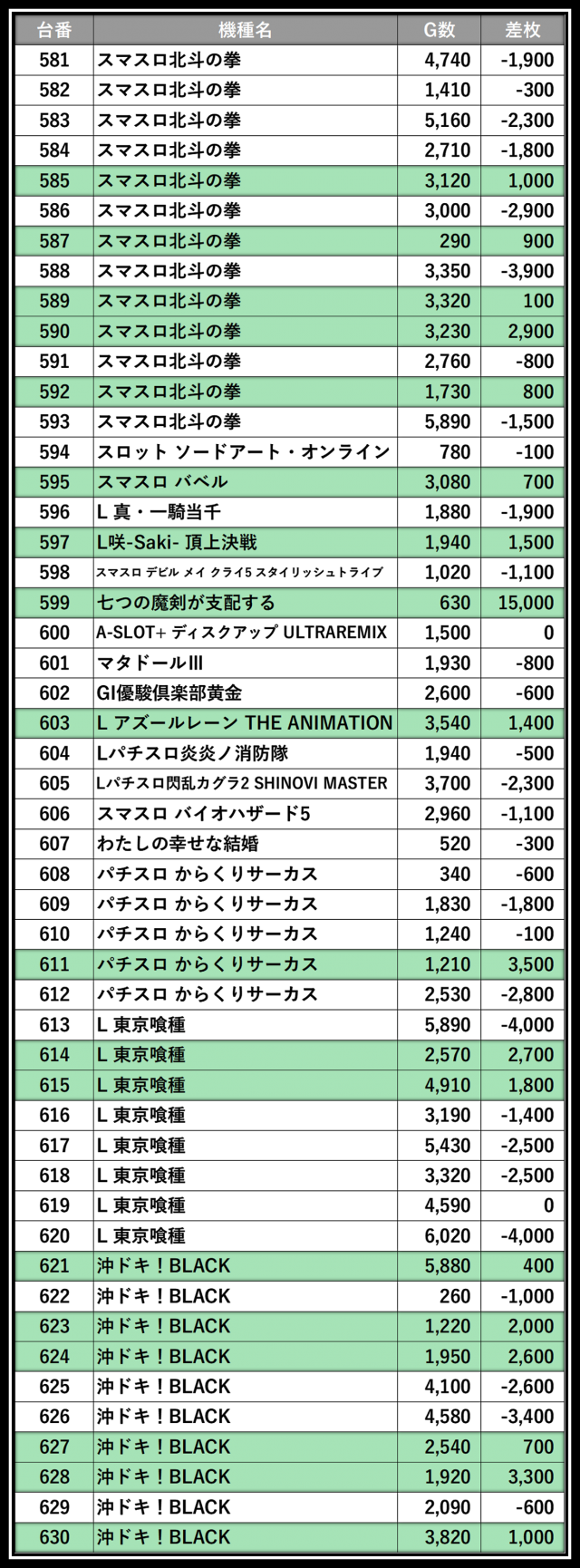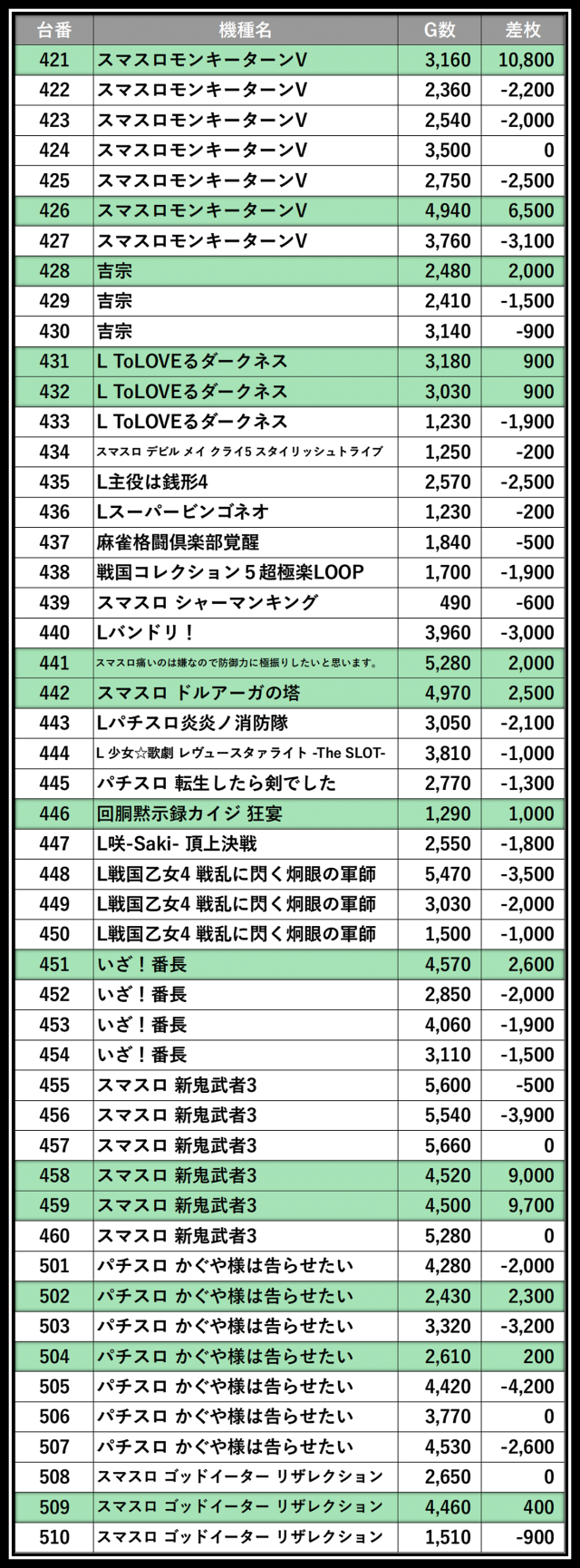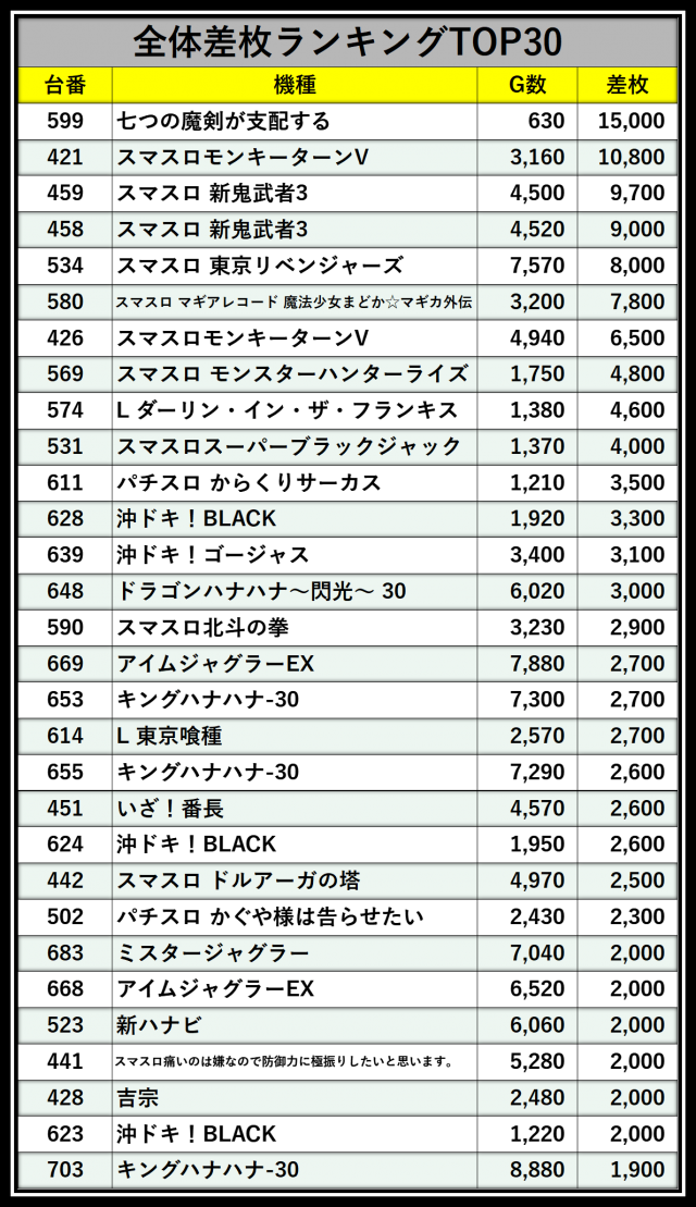 ※差枚数順に掲載しています