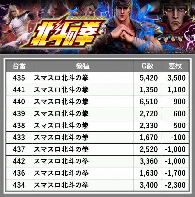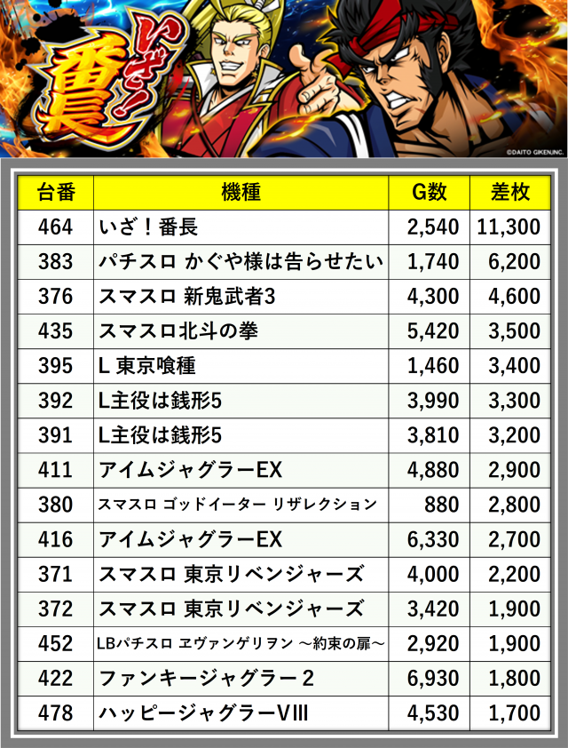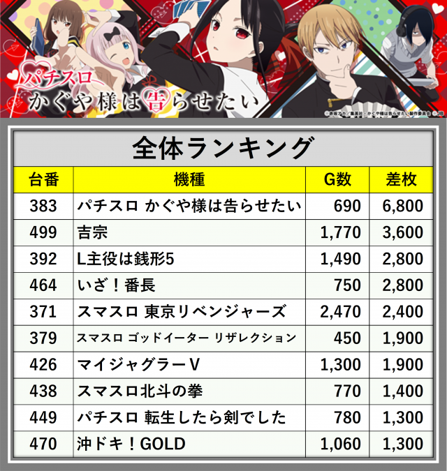 ※差枚数順に掲載しています