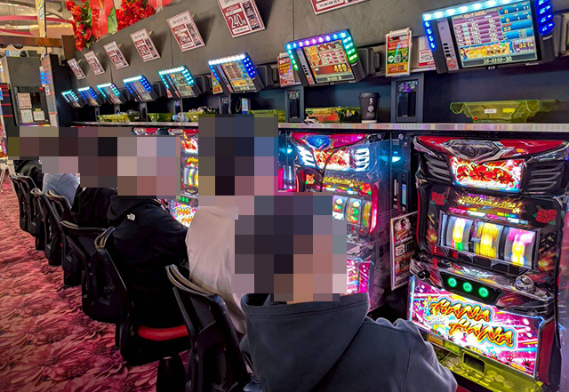 15時頃のパチスロでは、最新機種の「スマスロ 新鬼武者3」に楽しそうなプレイヤーがズラリと並んでいた。