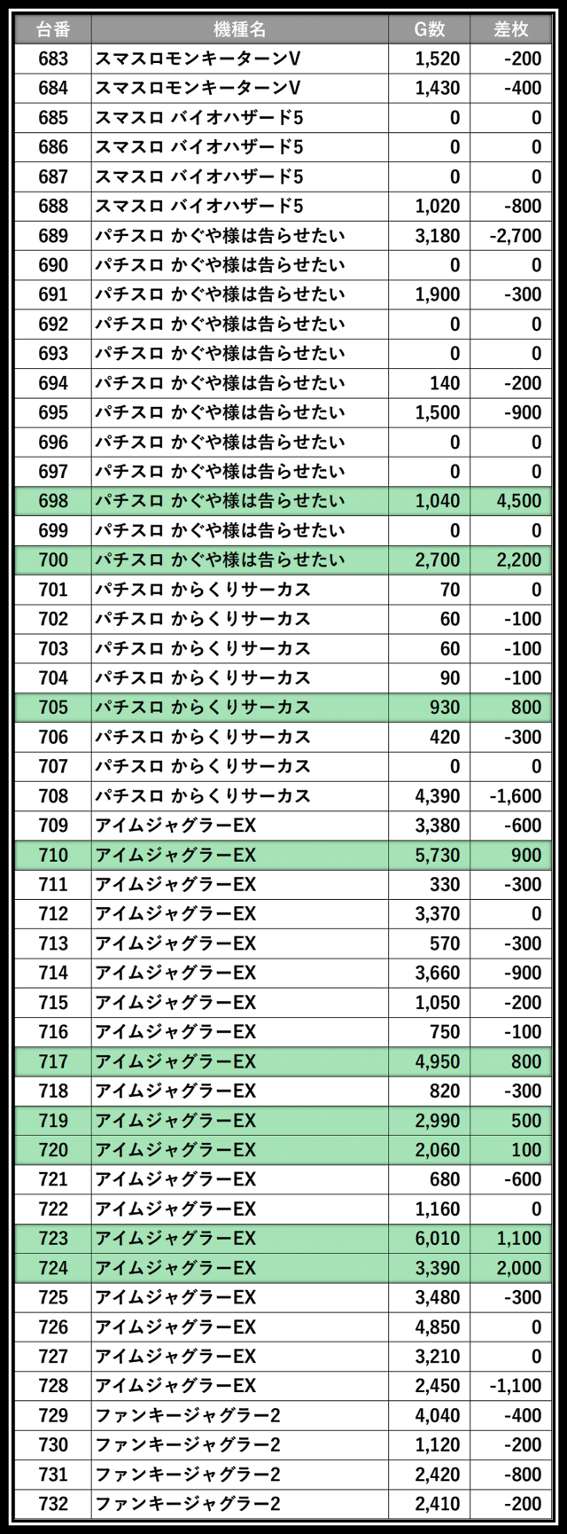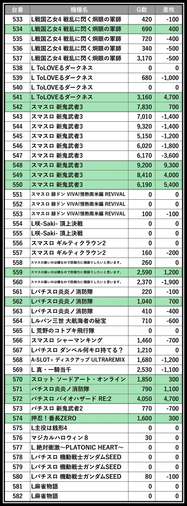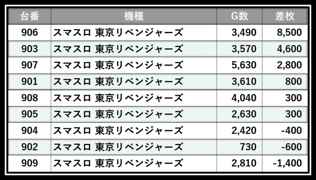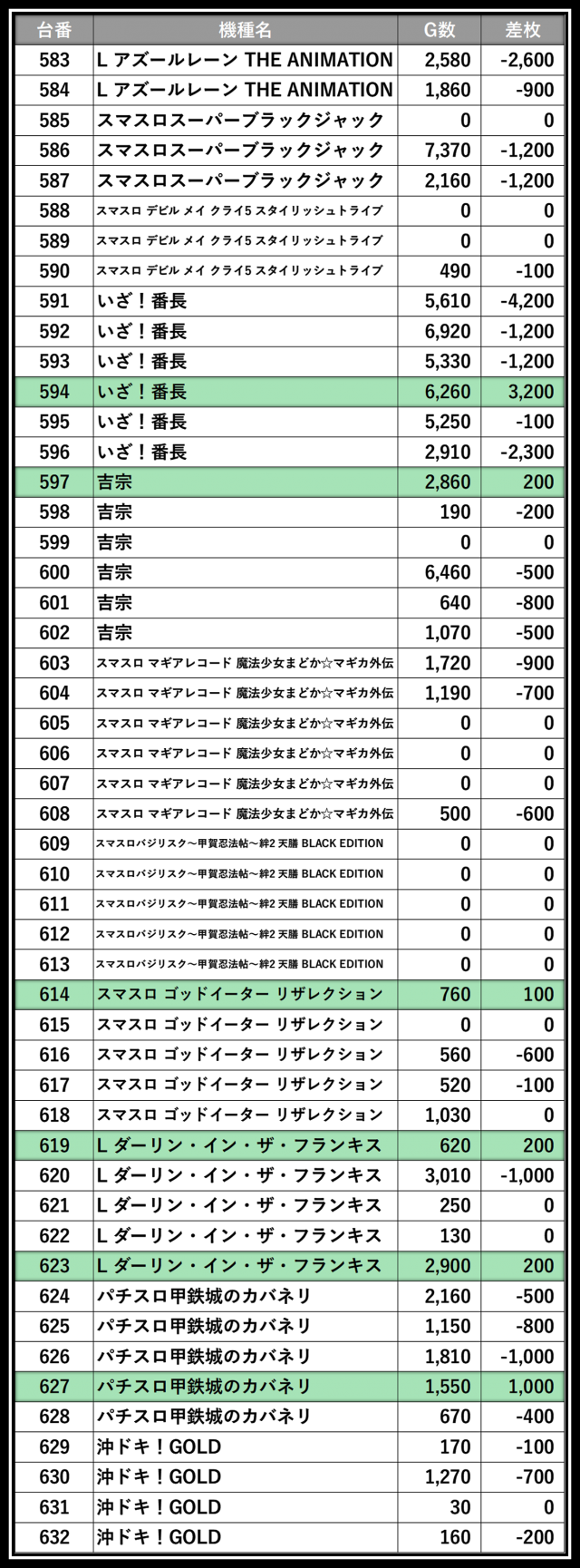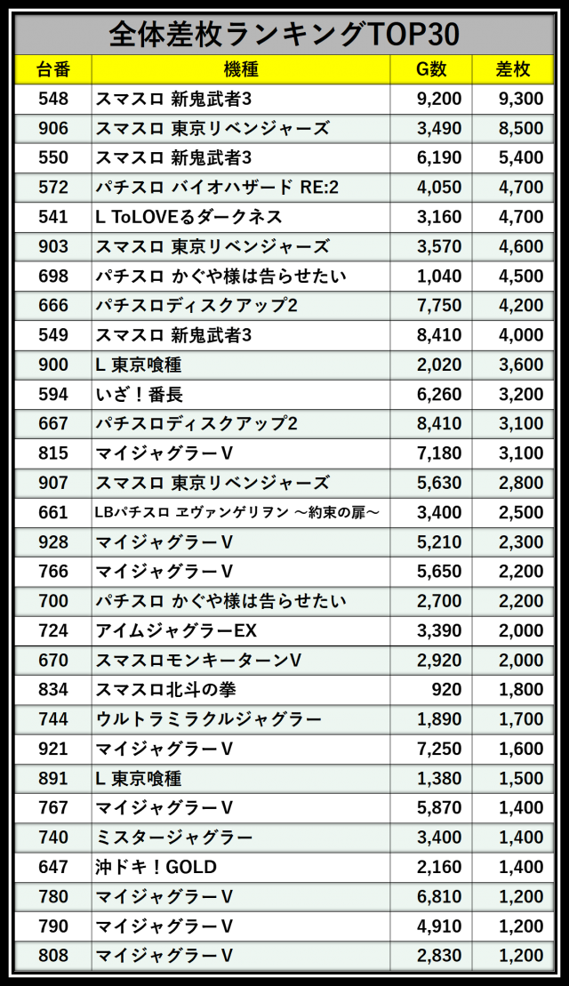 ※差枚数順に掲載しています