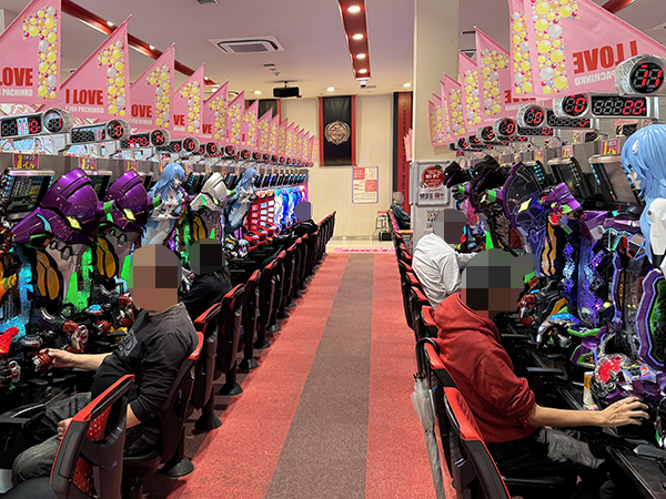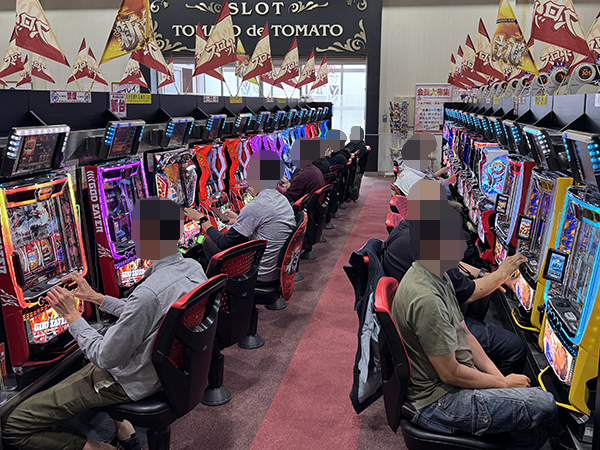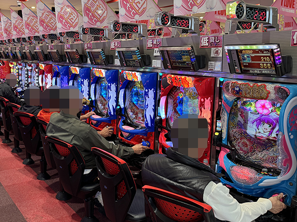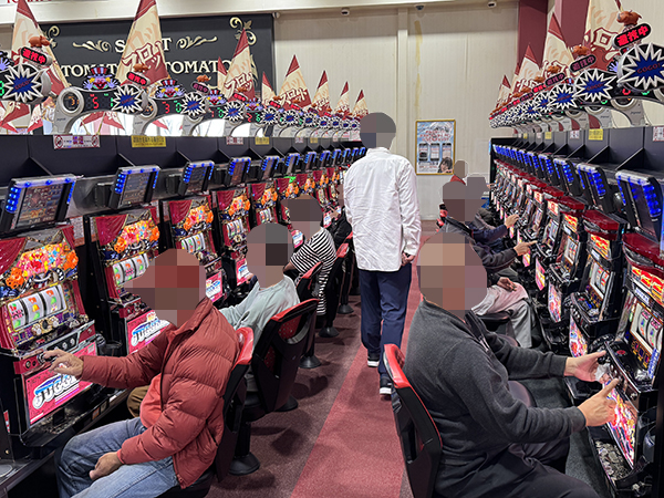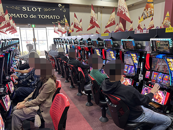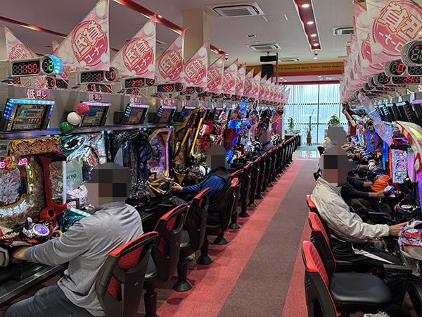 取材時は既に多くのプレイヤーが集結し、パチンコ・パチスロを問わずにぎやかな状況となっていた。