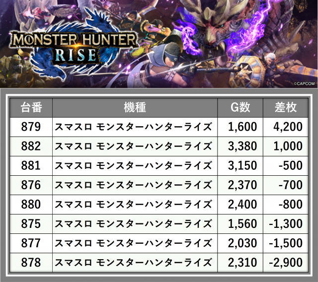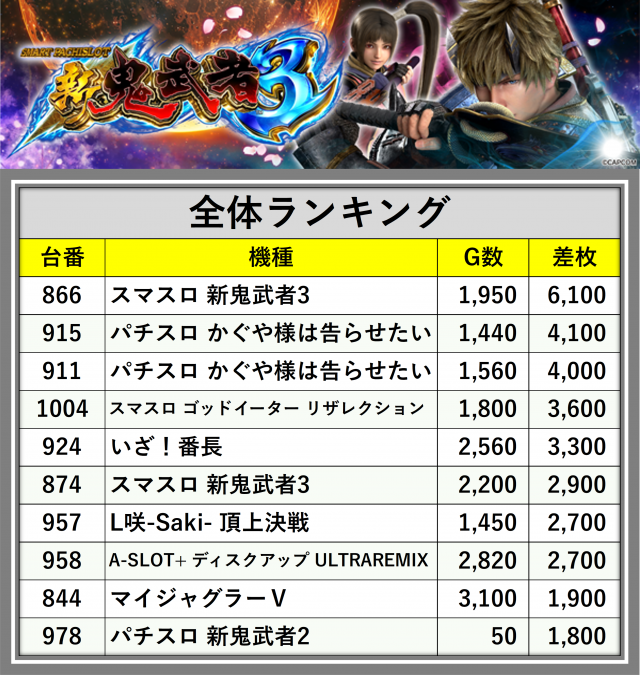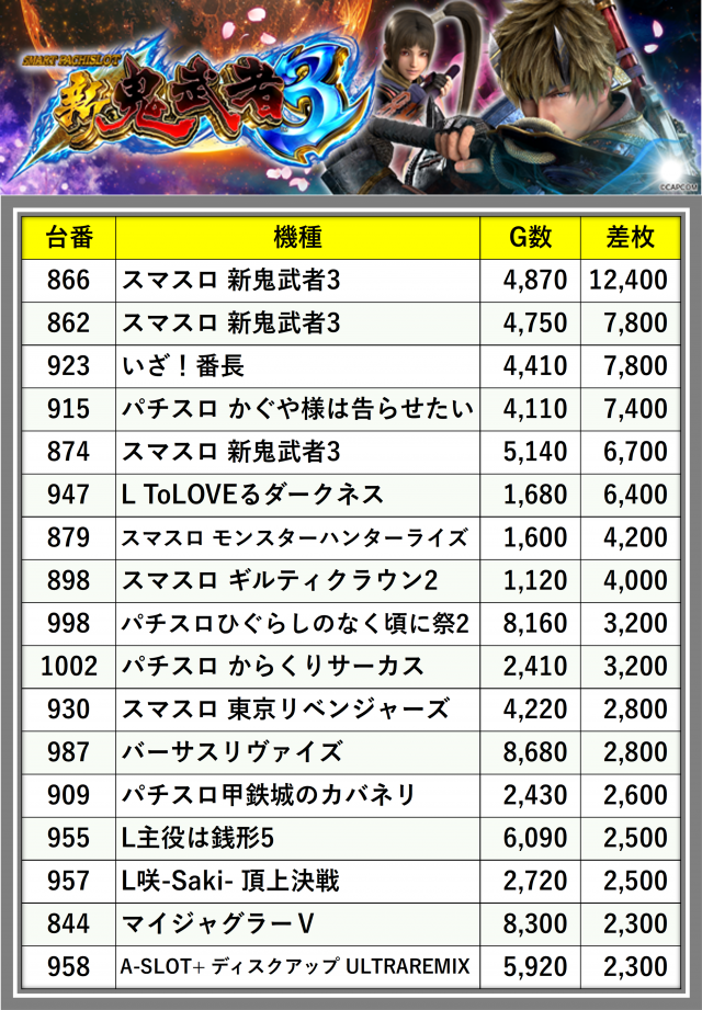 厳選された取材対象機種をはじめ、その他スロット全体から好記録が飛び出した!プレイヤーが楽しんだ1日を下記データにて振り返ってみて欲しい。