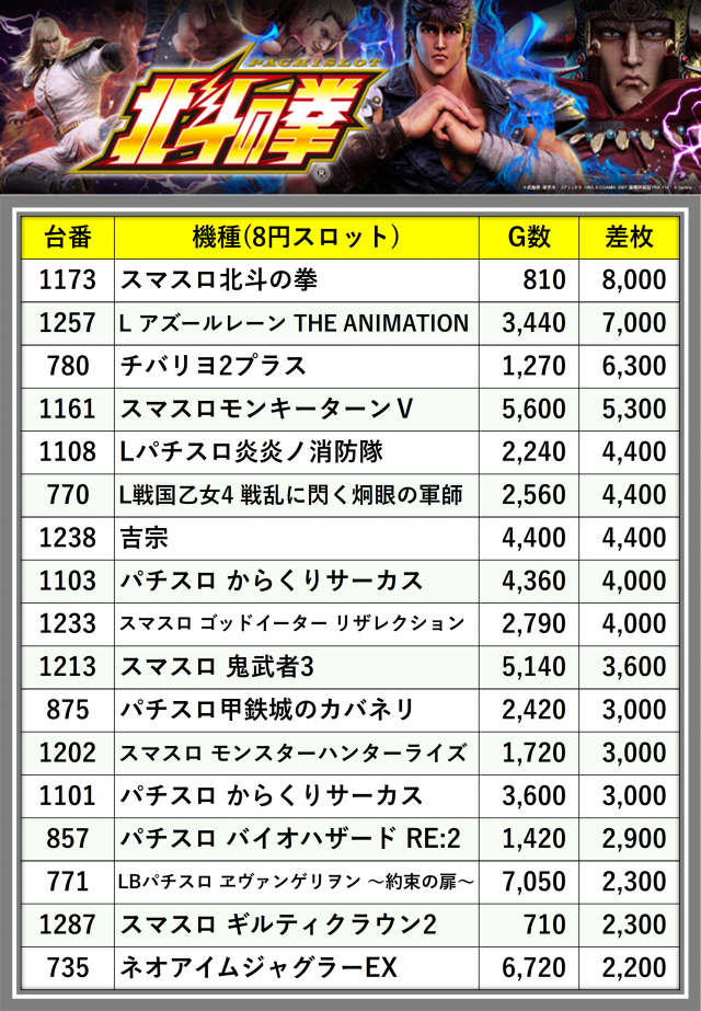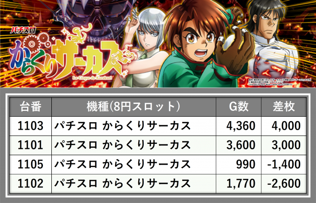 厳選された取材対象機種をはじめ、その他スロット全体から好記録が飛び出した!プレイヤーが楽しんだ1日を下記データにて振り返ってみて欲しい。