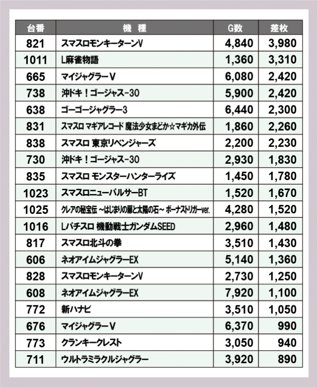 機種別差枚ランキング